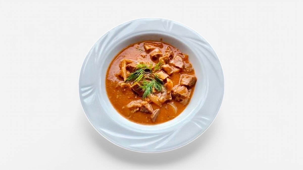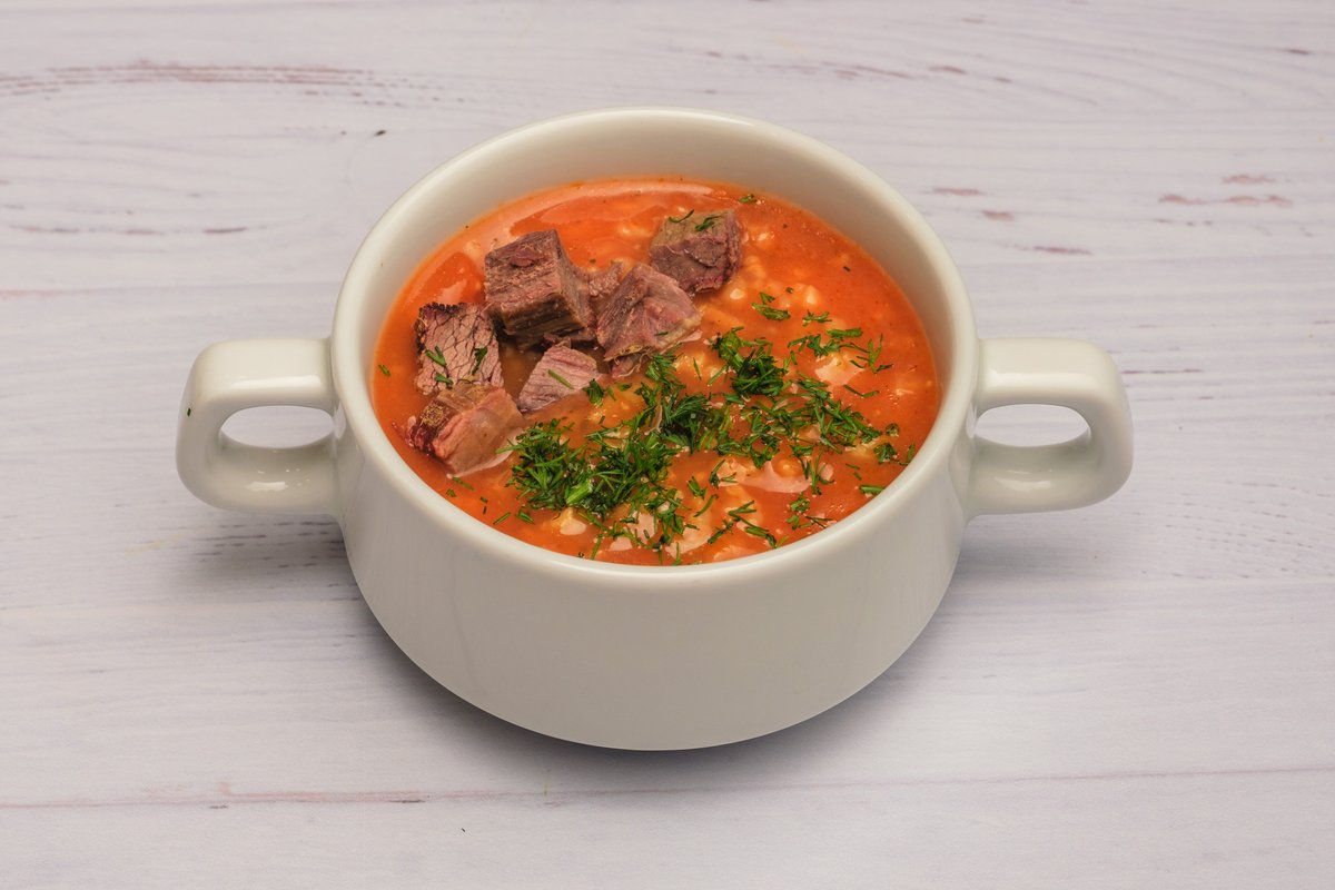 Бульон из говядины с добавлением картофеля, моркови, лука репчатого, казы .Подается с уйгурской лепешкой.