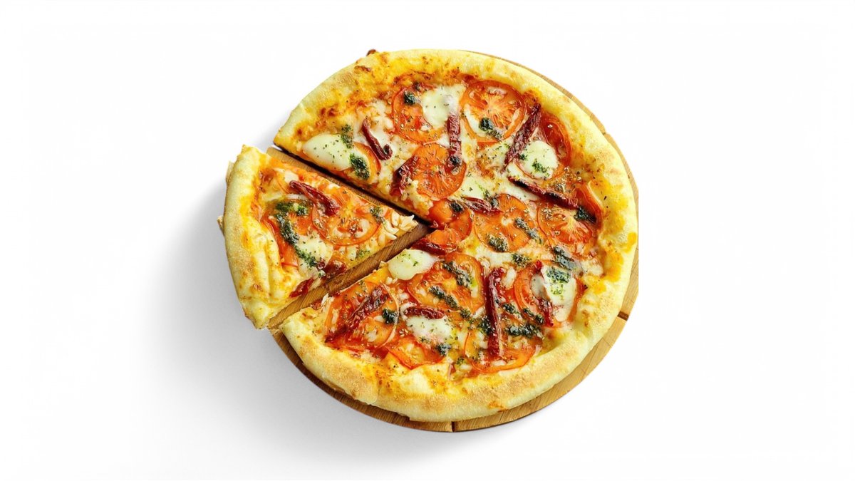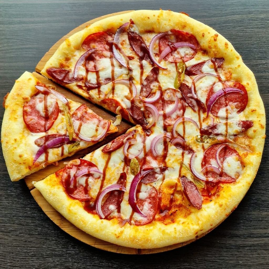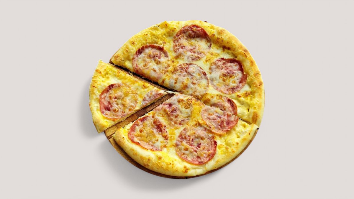 Тесто для пицц,колбаски охотничьи, руляда куриная копченая, соус томатный, сыр, помидоры. 550г