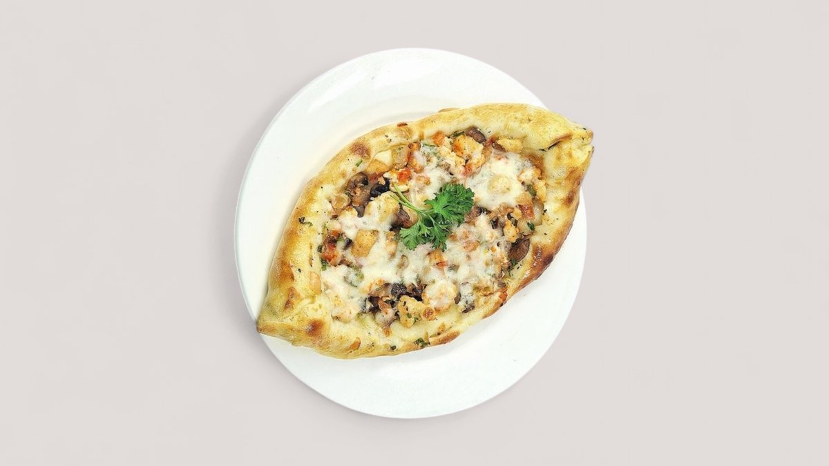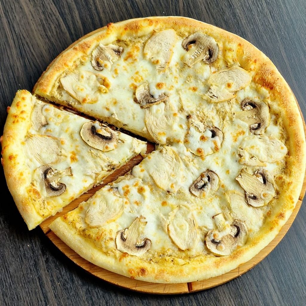Тесто для пицц,филе куриное отварное,грибы шампиньоны жареные, помидоры свежие, сыр твердый, соус томатный. 650г