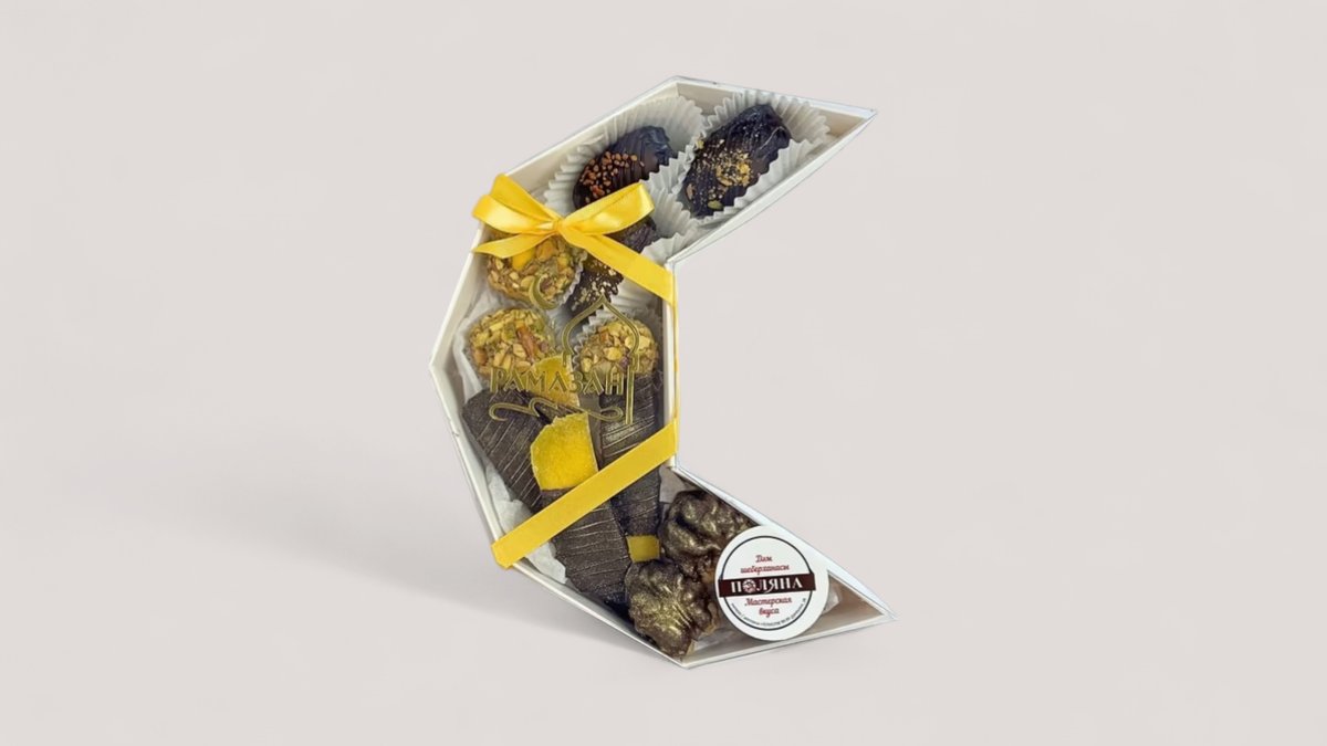 Бельгийский шоколад, манго,грецкий орех,трюфель фисташка,финик, кешью, шоколадная глазурь.