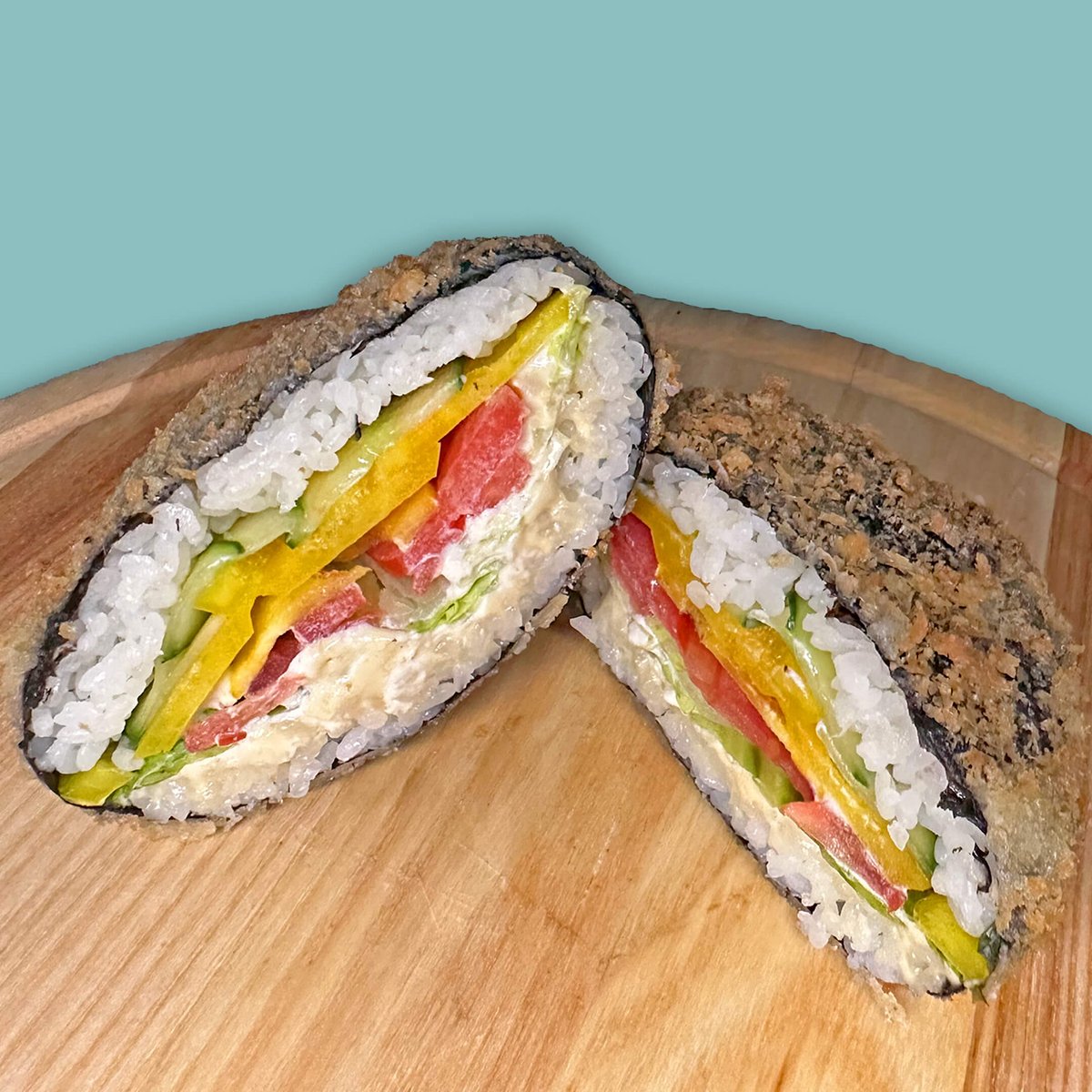 нори,рис,перец болгарский, огурец,помидор, сырно-чесночный соус,лук зеленый, соус унаги,кунжут