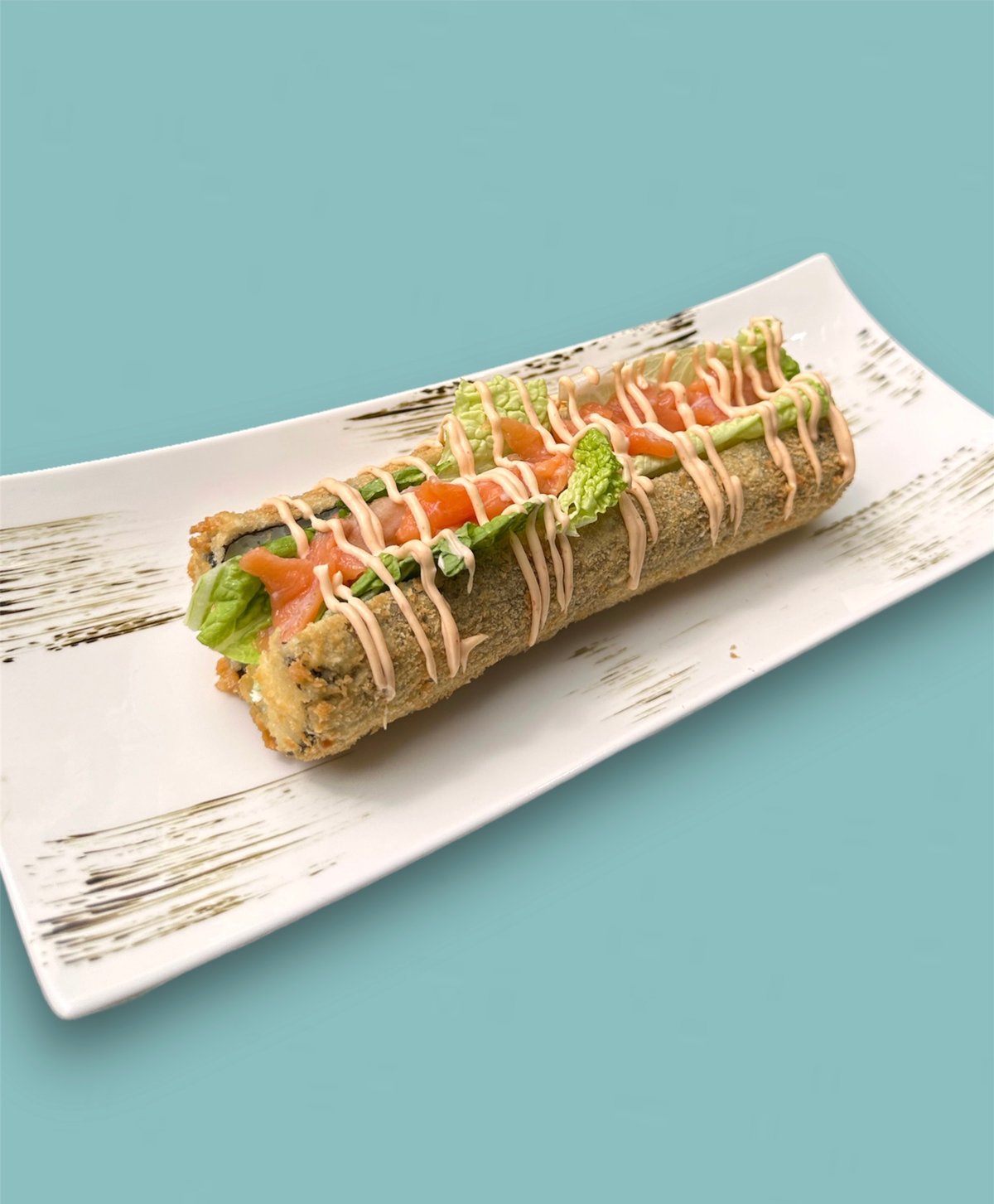 нори,рис, сыр креметте, лосось, помидор, соус шрирача,икра тобико, зеленый лук