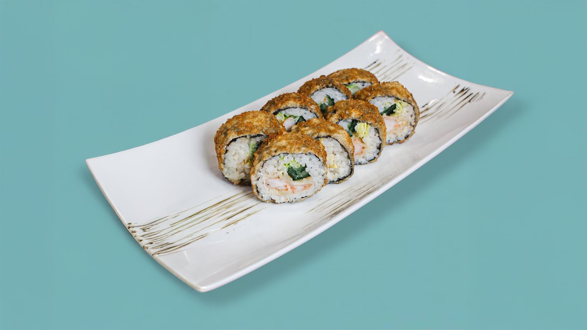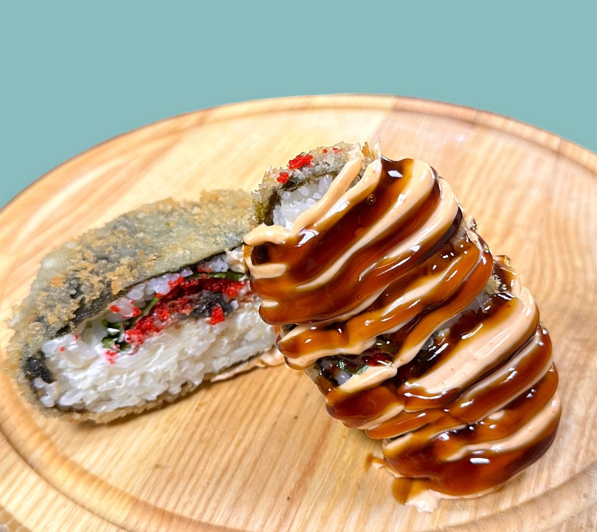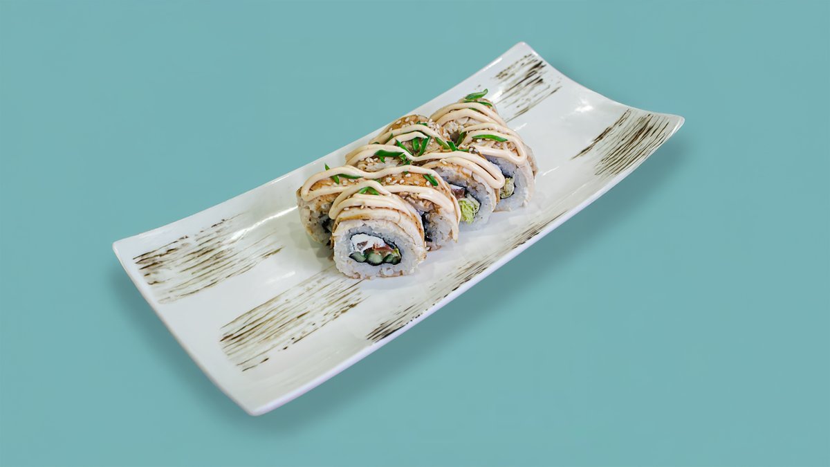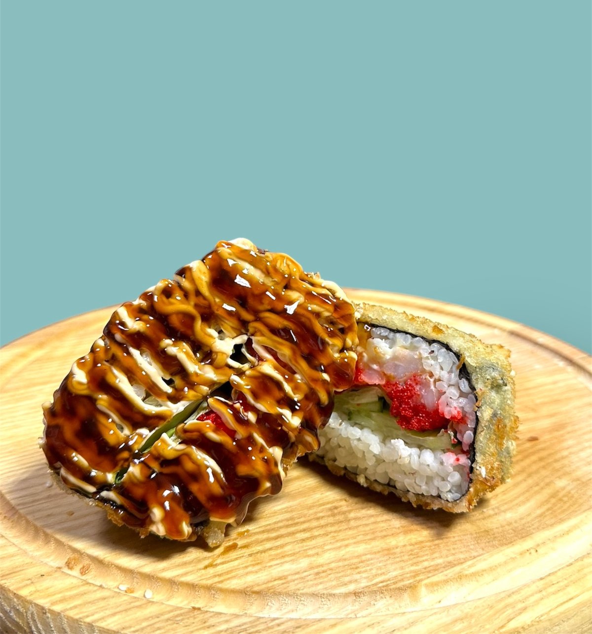 Рис, Нори, Креветка, Креметте, майонез, Огурец, Лист салата, Тобико, Спайси соус, Унаги
