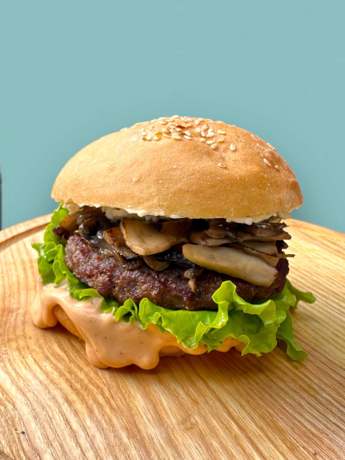 Говяжья котлета, шампиньоны,лист салата, соус тар-тар, фирменный соус