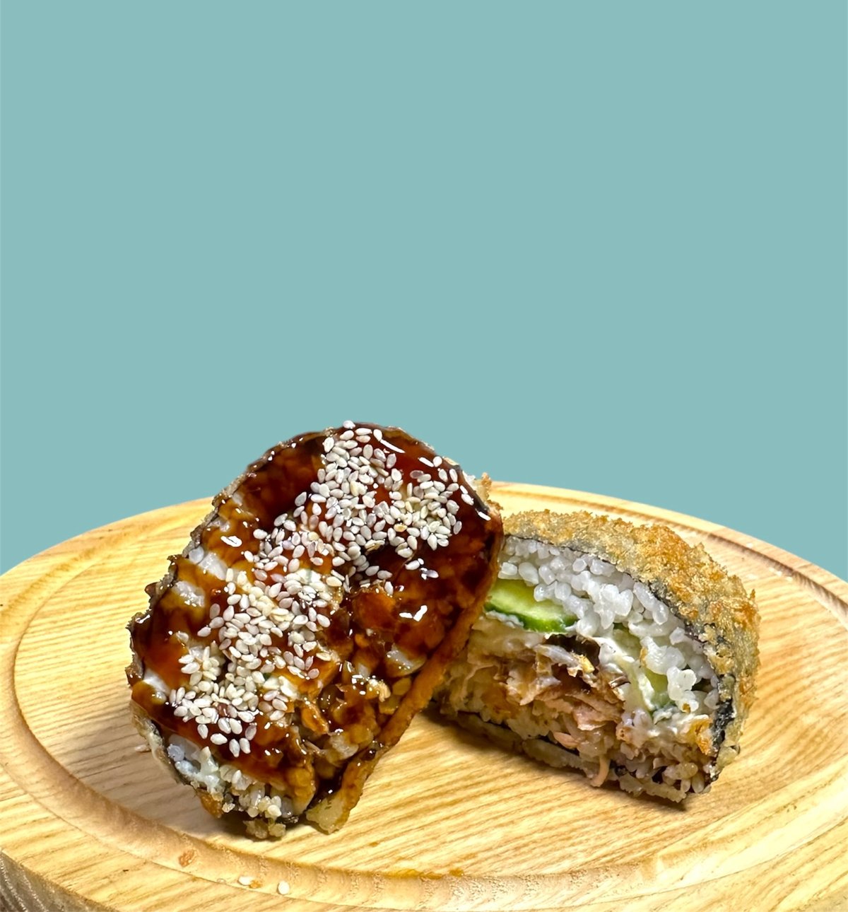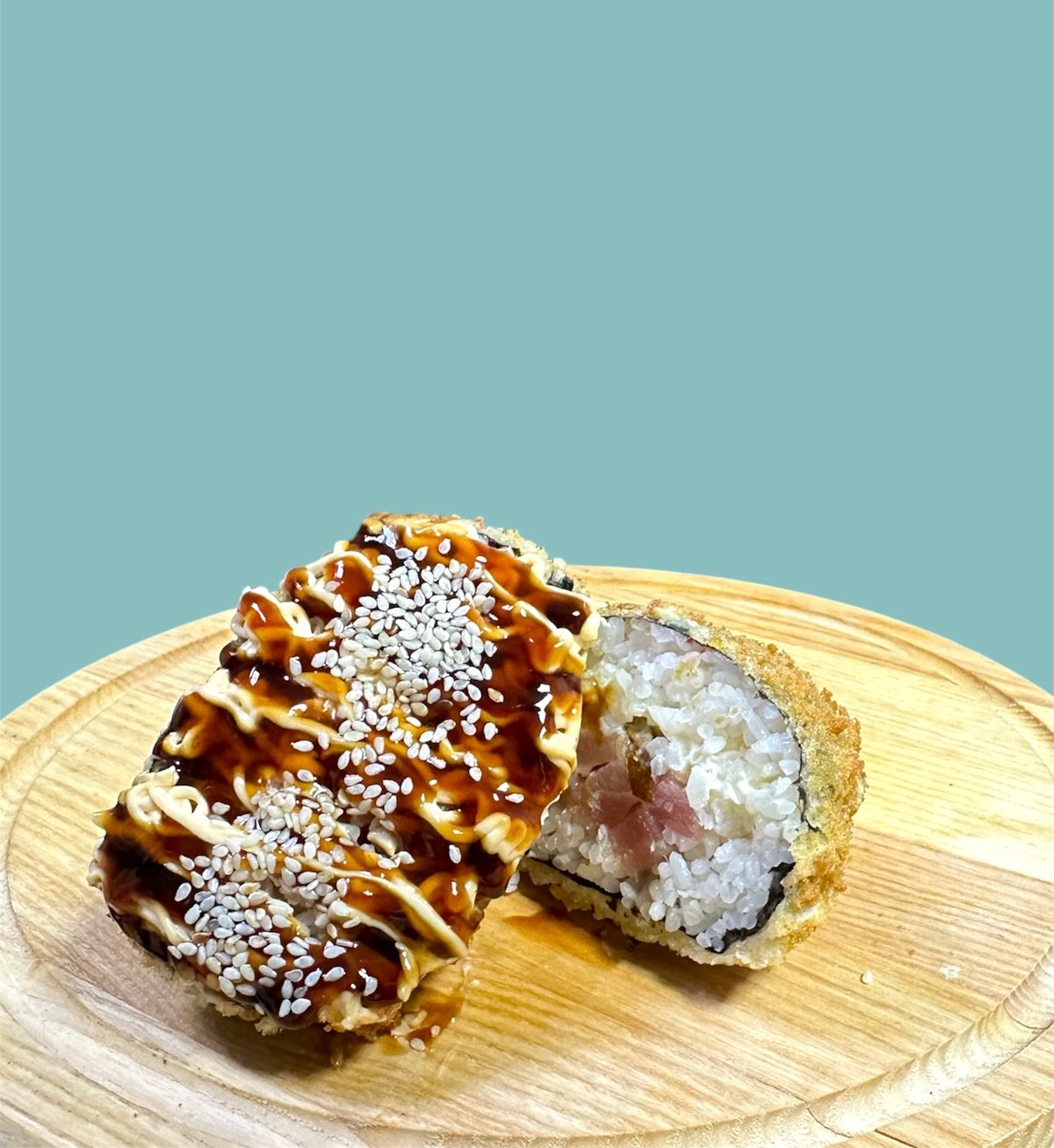 Рис, Нори, Лосось, Стружка тунца, Огурец, Терияки, Креметте , Майонез, Кунжут