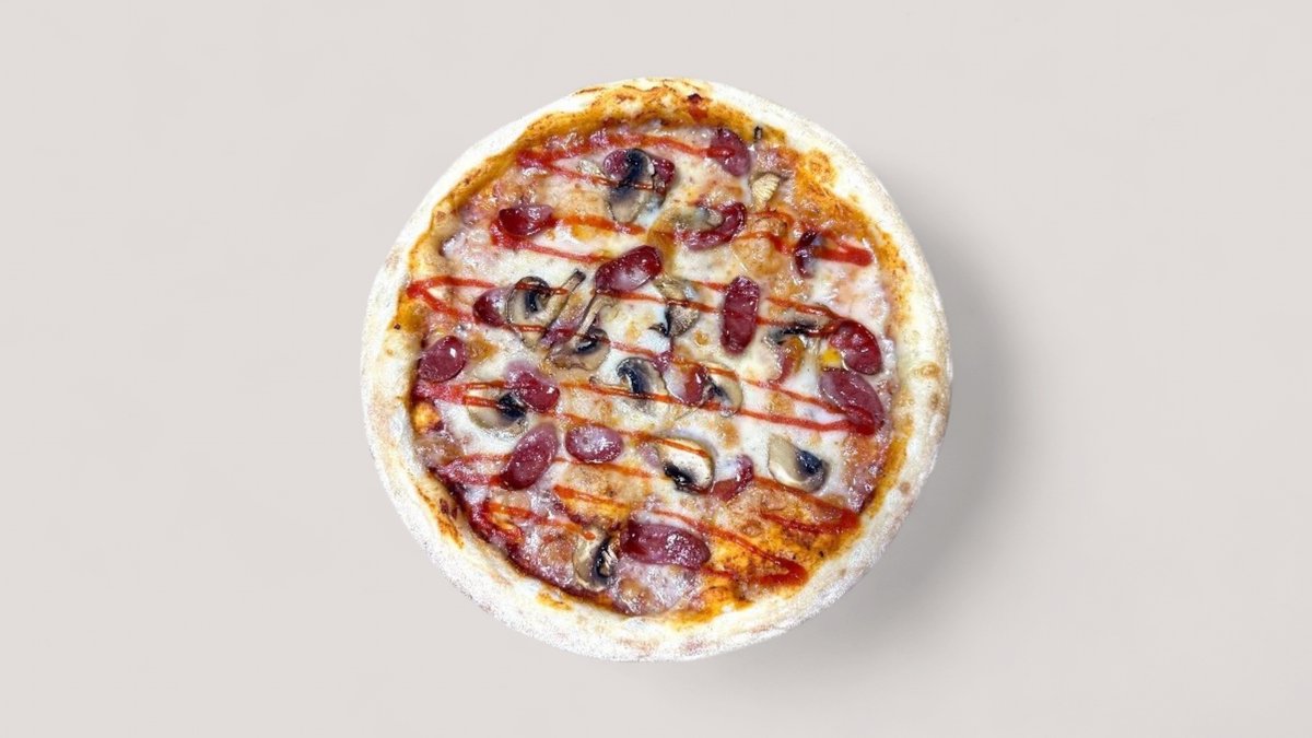 охотничьи колбаски, шампиньоны,сыр моцарелла, соус чили, томатный соус