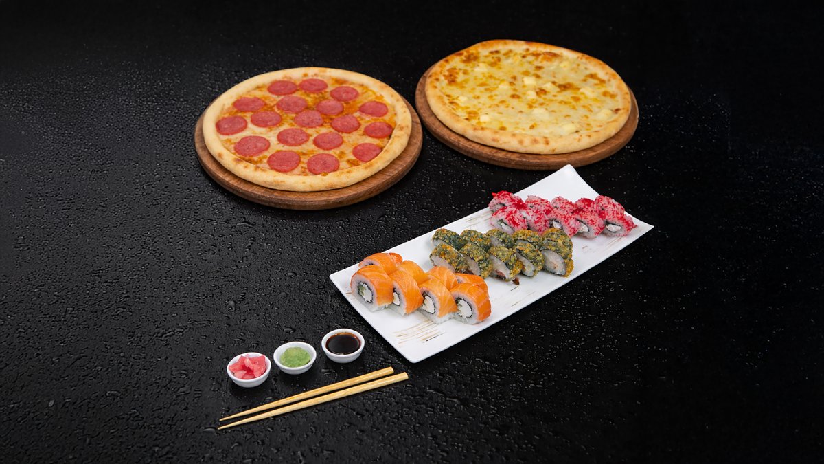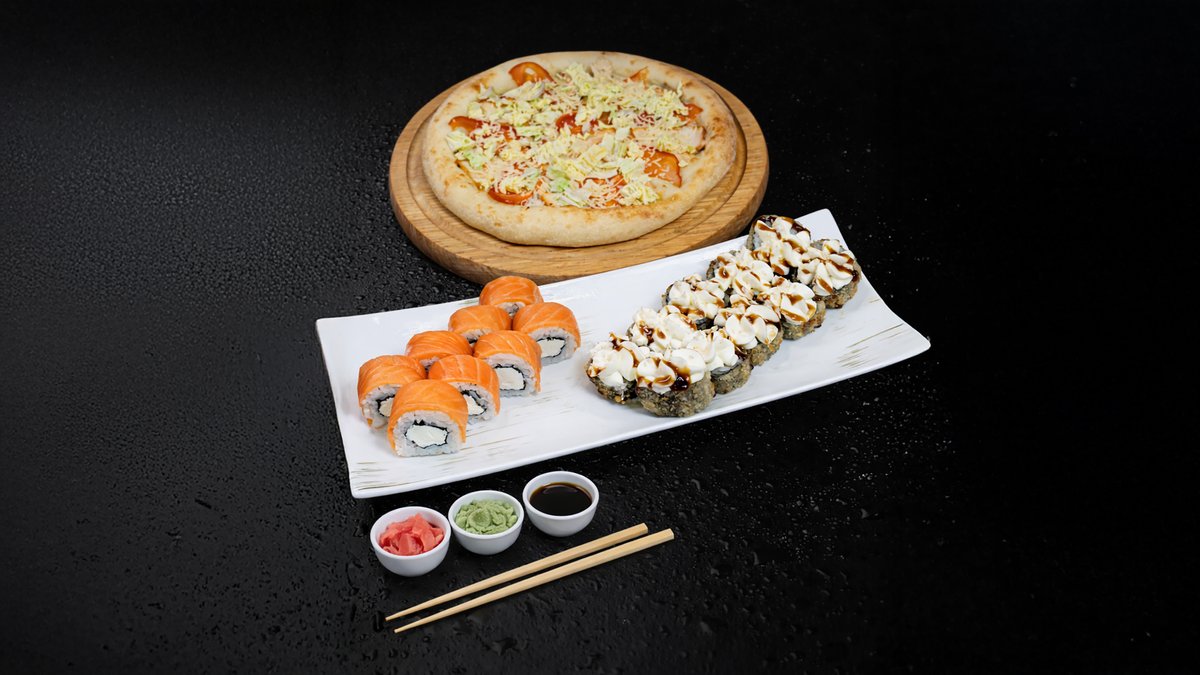🔸 Филадельфия с огурцом (8шт) 🔸 Сяке темпура (10шт) 🔸 Калифорния с крабом (10шт) 🔸 Пицца 4 сыра 30см 🔸 Пицца Салями 30см 🔸Чебуречки или картофель фри – 1 порция