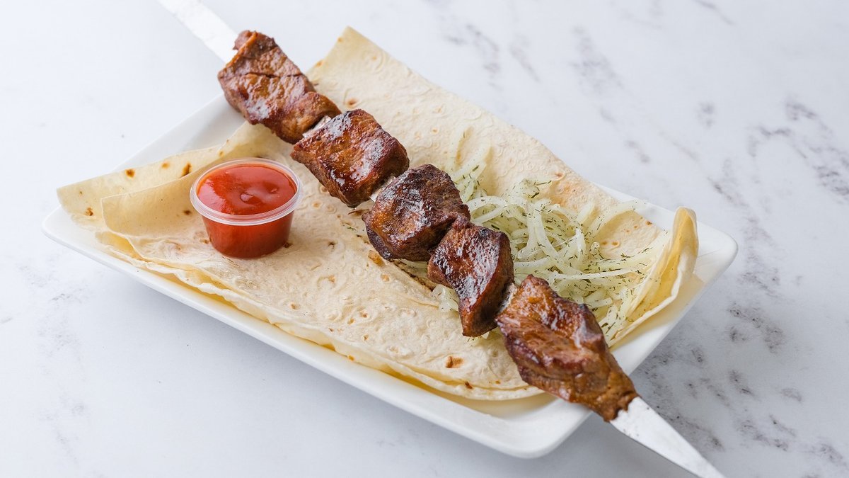 Мясо конины, помидор, корейская морковка, лист салата, фри, соус, лаваш