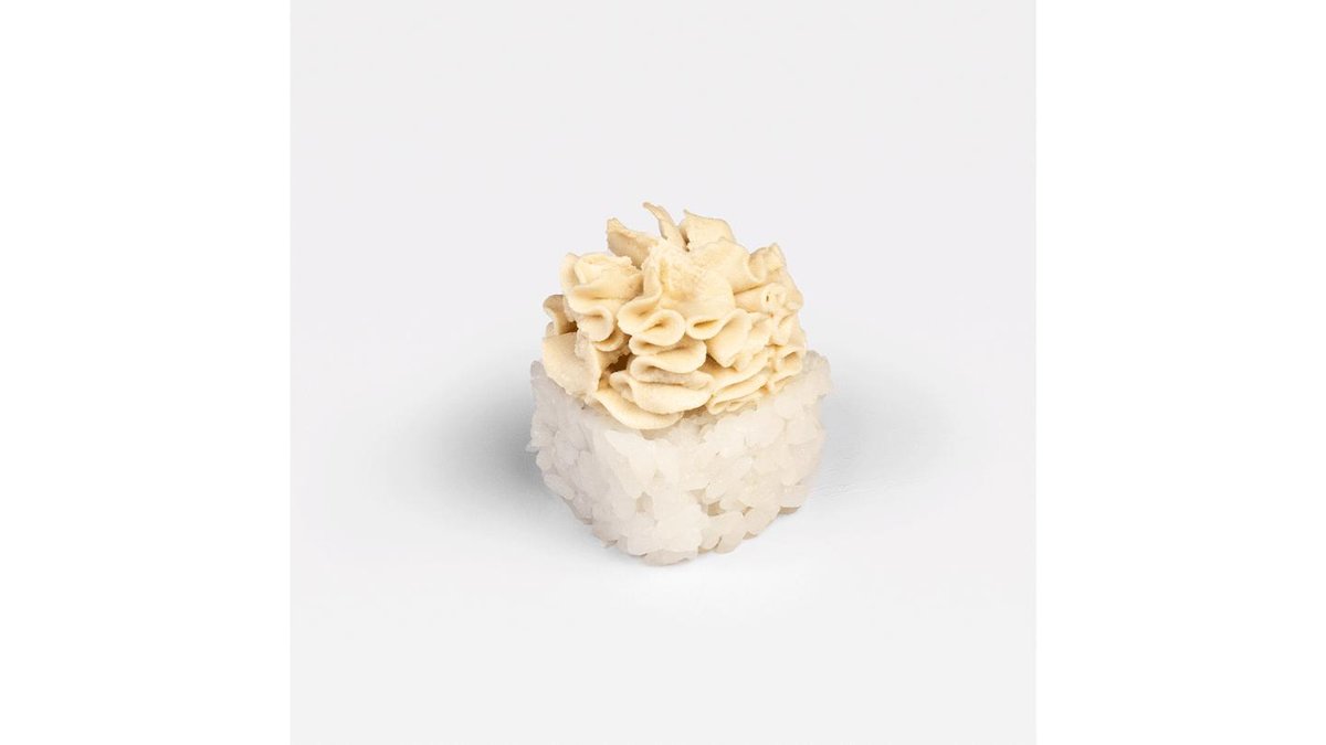 350 г.Филе цыплёнка, сливочный сыр, маринованный огурчик, тамаго, чеснок, сырная шапка, нори.