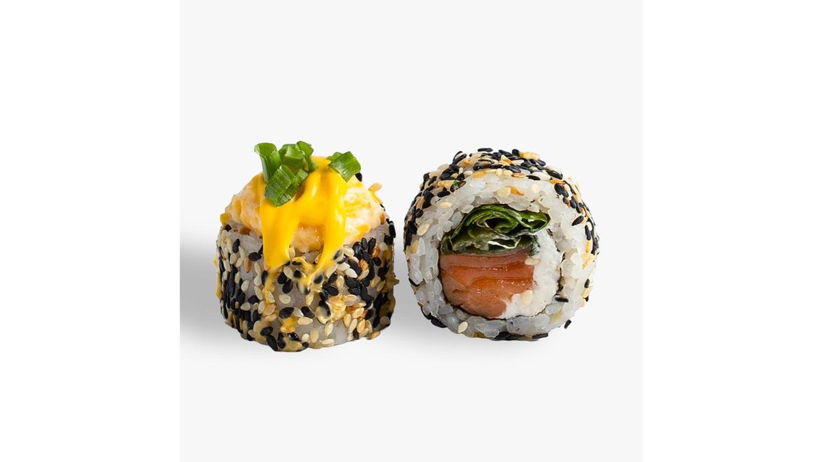 320 г.Лосось, сливочный сыр, лист салата, масаго, кунжут, сырный соус хайнц, зеленый лук, сырная шапка, нори.