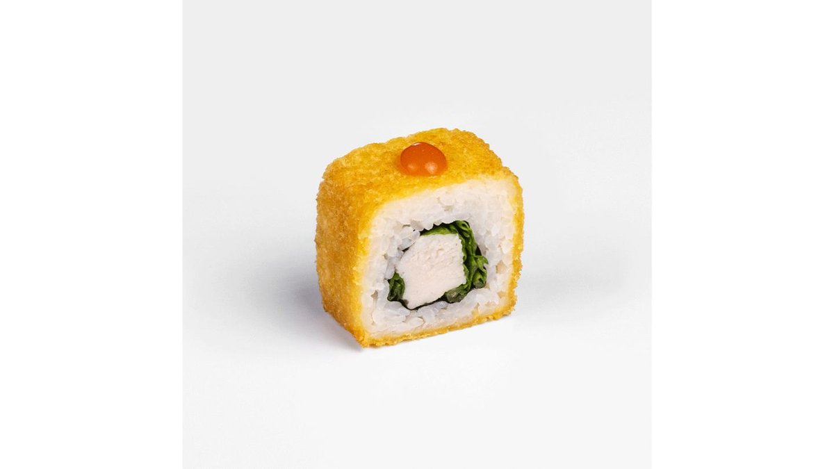 345 г.Филе цыплёнка, лист салата, зеленый лук, соус спайси, темпура, сухари панко, нори.