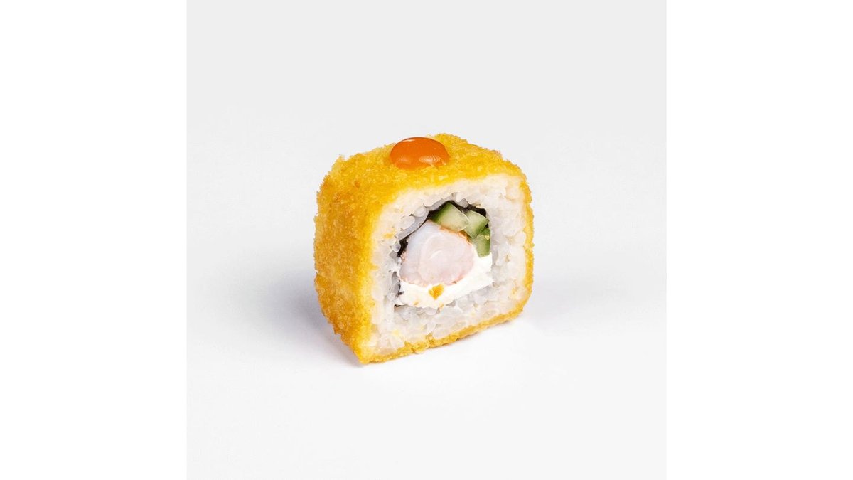 360 г.Креветка, сливочный сыр, огурец, соус спайси, темпура, сухари панко, нори.