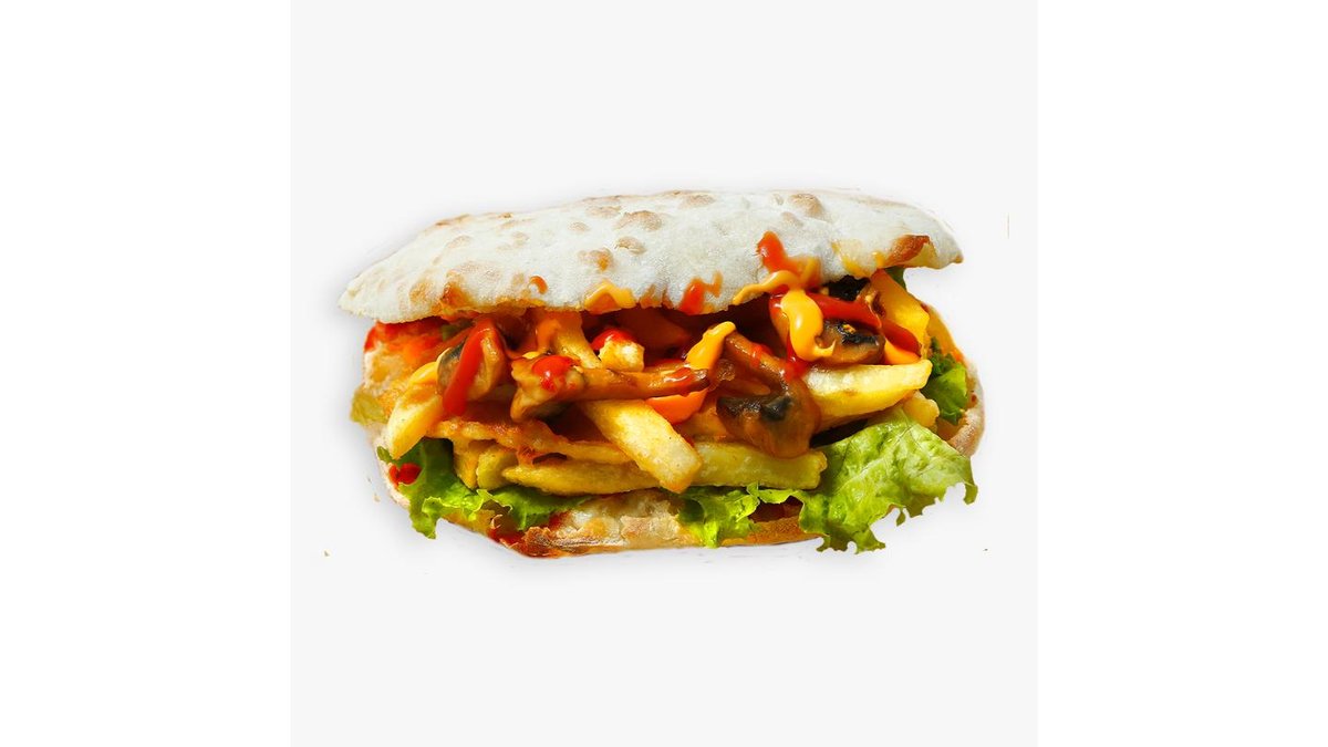 370 г. Сэндвич в хрустящем тесте с филе цыпленка и картофелем фри, жареными грибами, корнишонами, листом салата, сырным и томатным соусом и сыром моцарелла.