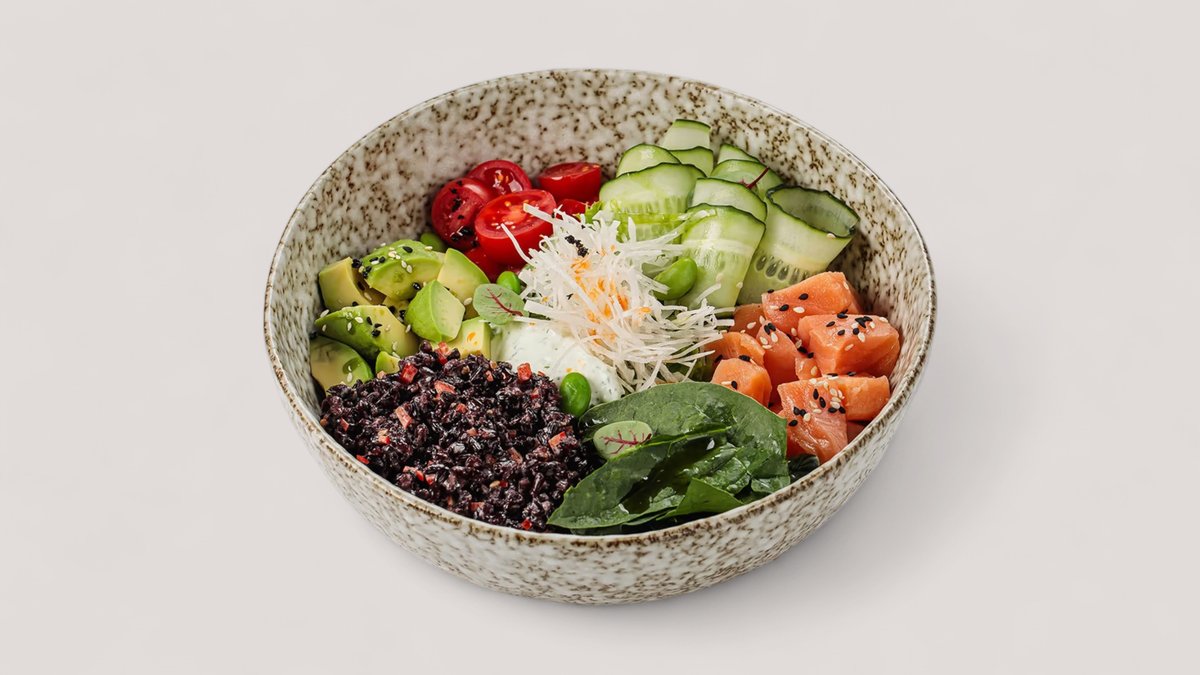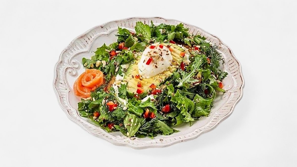 Злаковый хлеб, яйцо пашот, авокадо, микс из зелени, семга слабосоленая, микс из семян и орех кешью, дзадзики соус