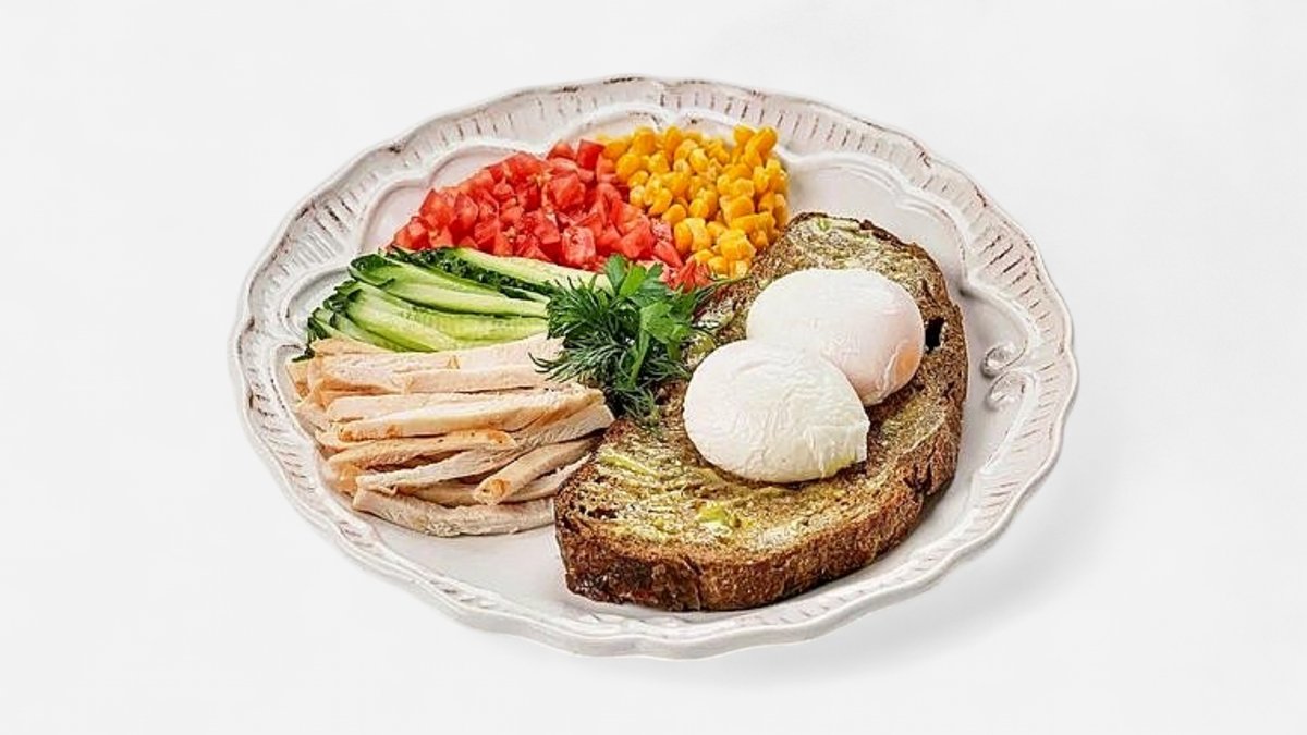 Яйцо пашот на бородинском хлебе с чесночным маслом, куриная грудка, свежие овощи