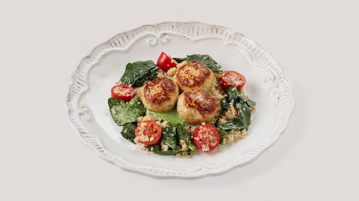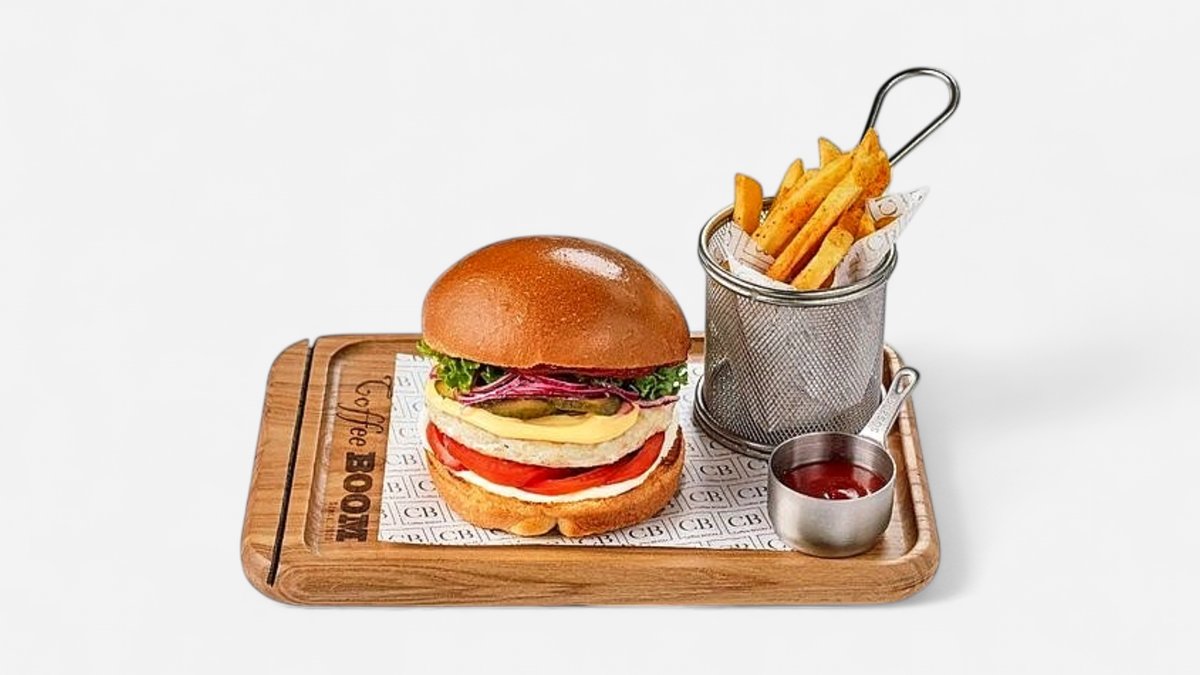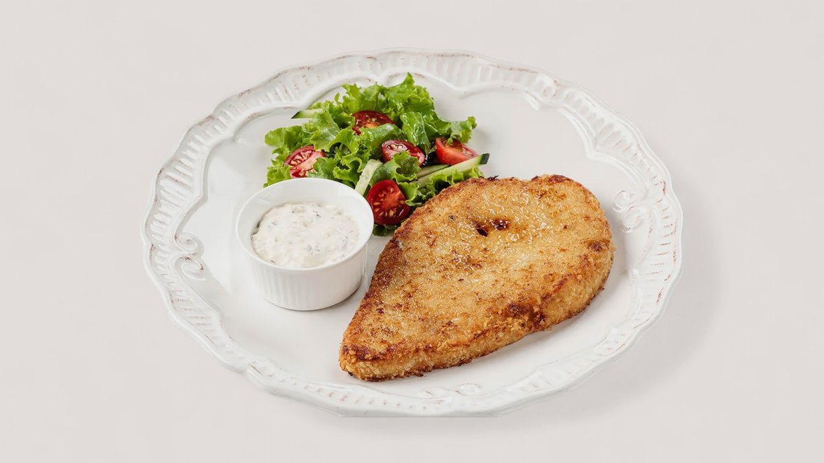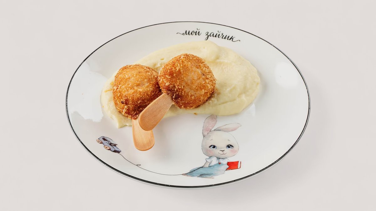 Куриная котлета 2 штуки, картофельное пюре, лист салата, огурец, черри, соус Дзадзики