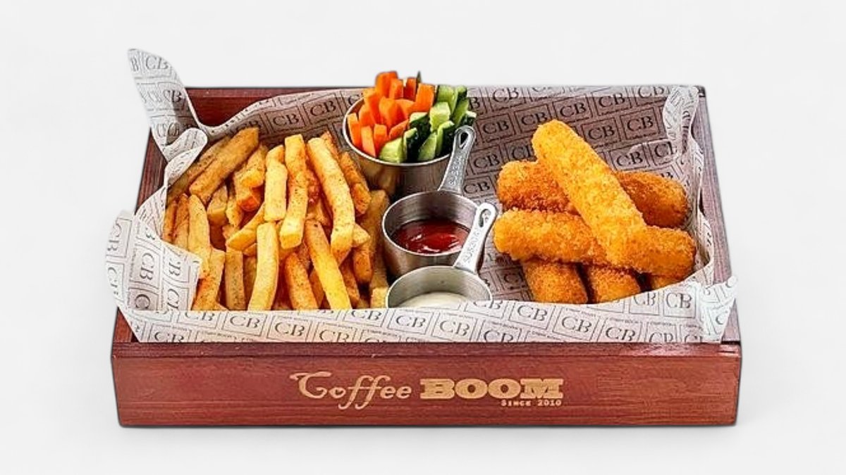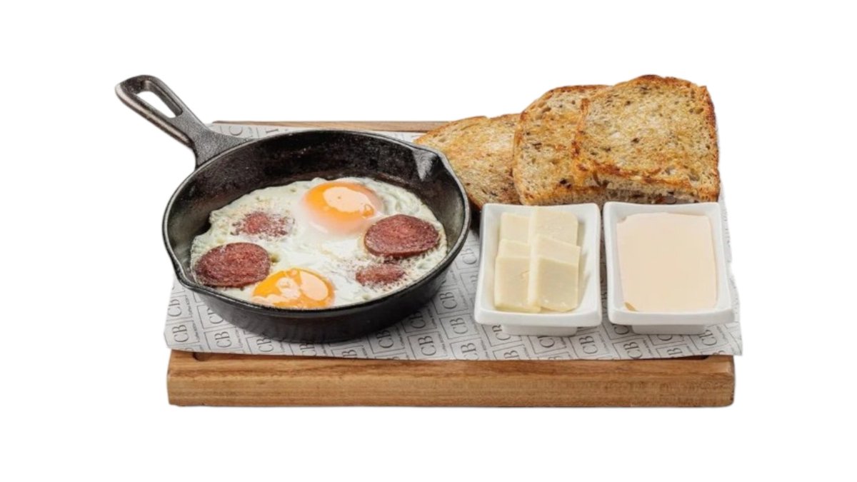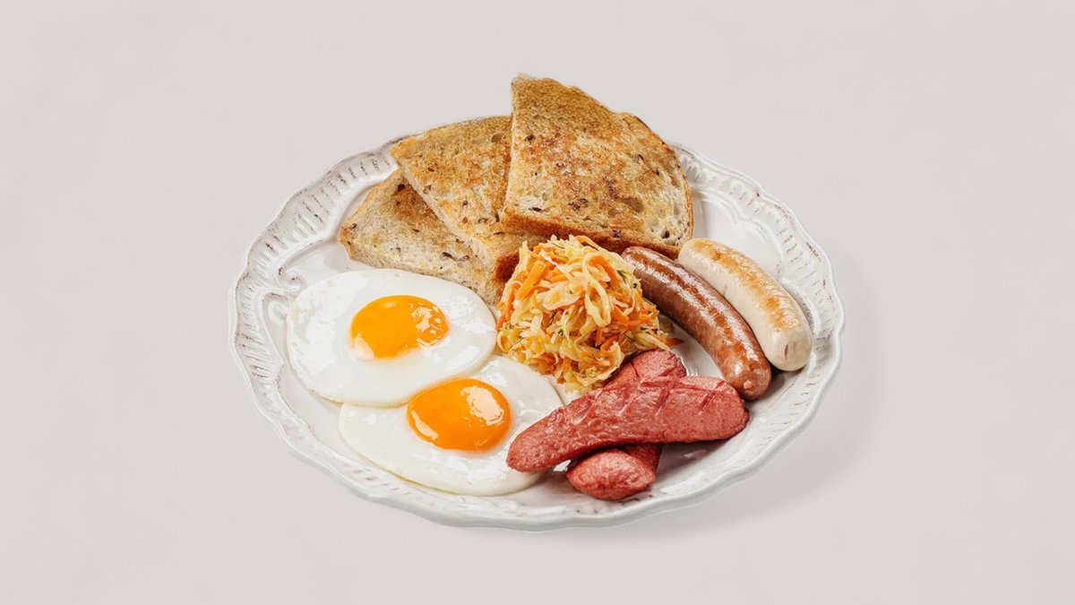 Глазунья, сарделька говяжья, куриная колбаска, говяжья колбаска, салат из жареной капусты и моркови, поджаристый хлеб