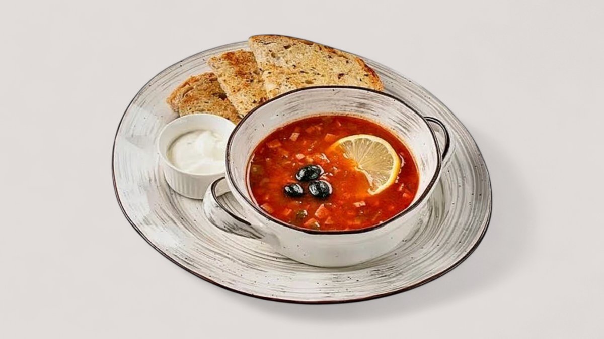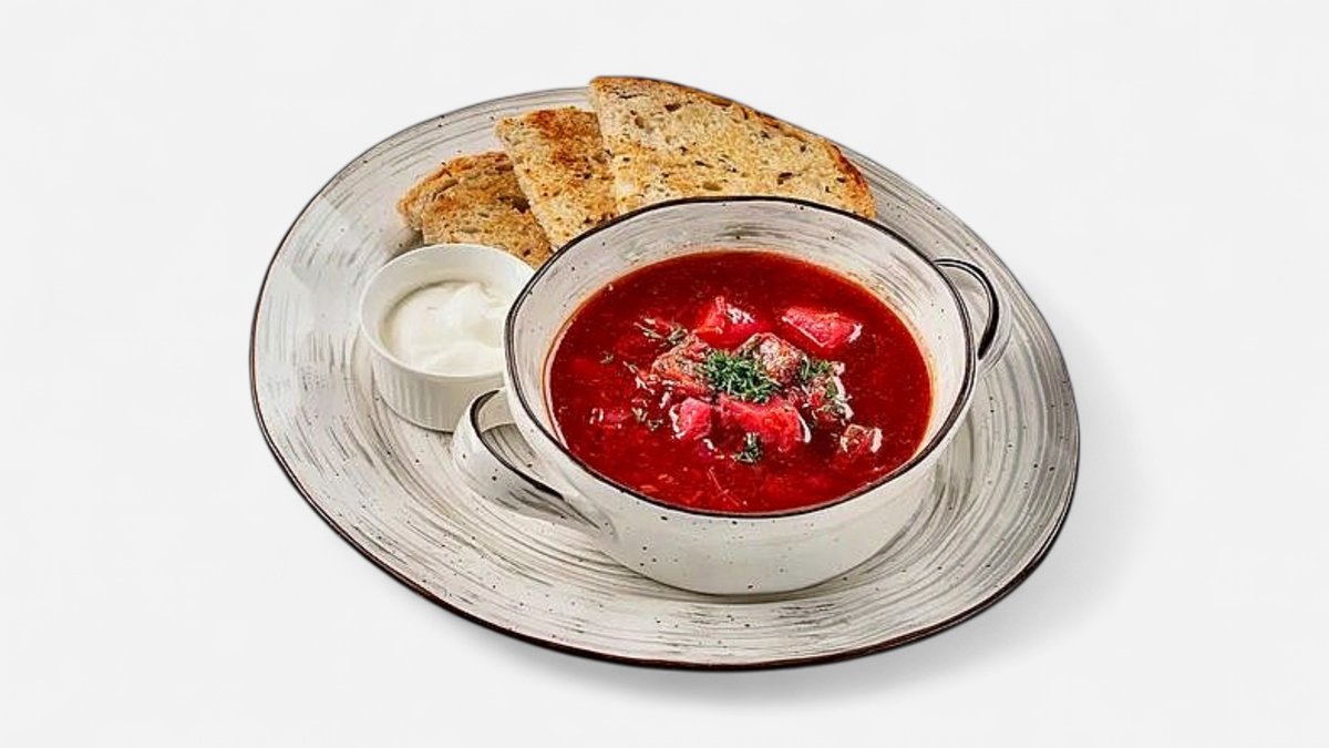 Капуста, морковь, лук, свекла, картофель, томатная паста, говядина отварная, зелень, сметана, поджаристый хлеб.