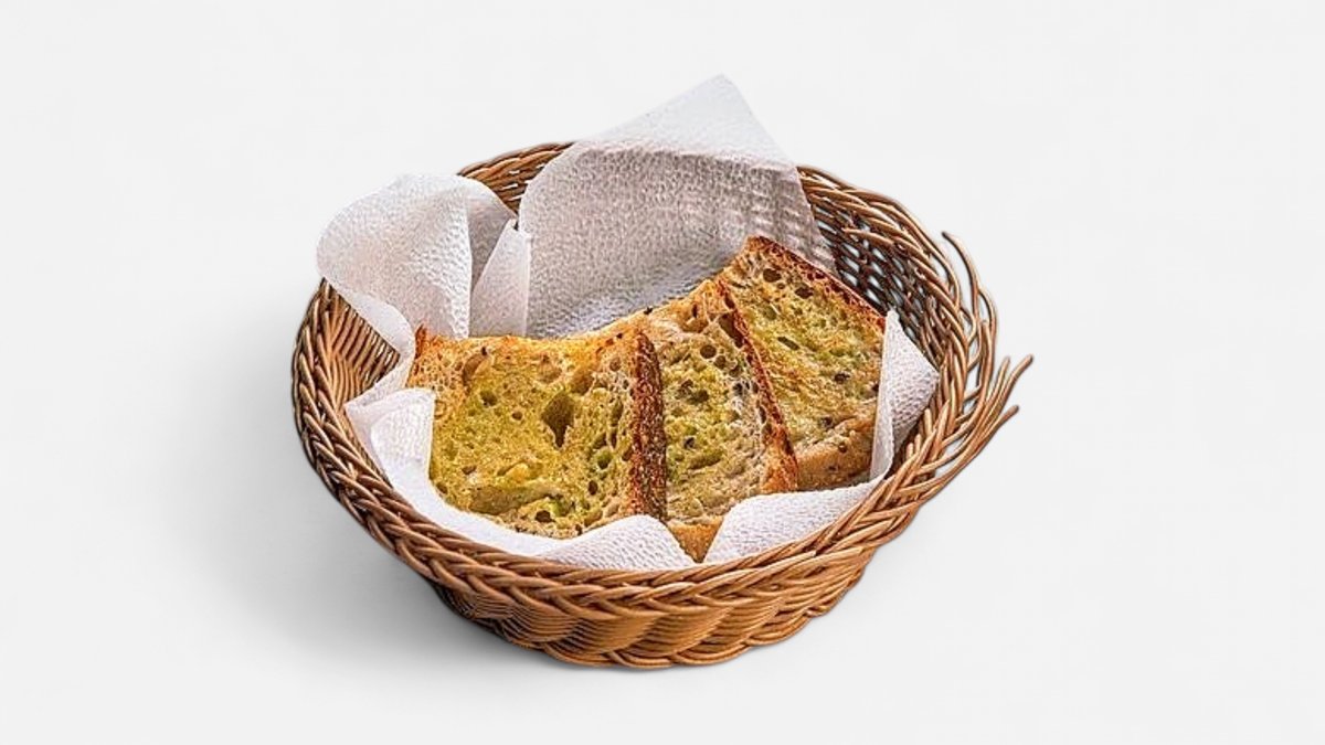 Глазунья из 3 яиц, лук репчатый, перец болгарский, помидоры, томат, чеснок, кинза, злаковый хлеб