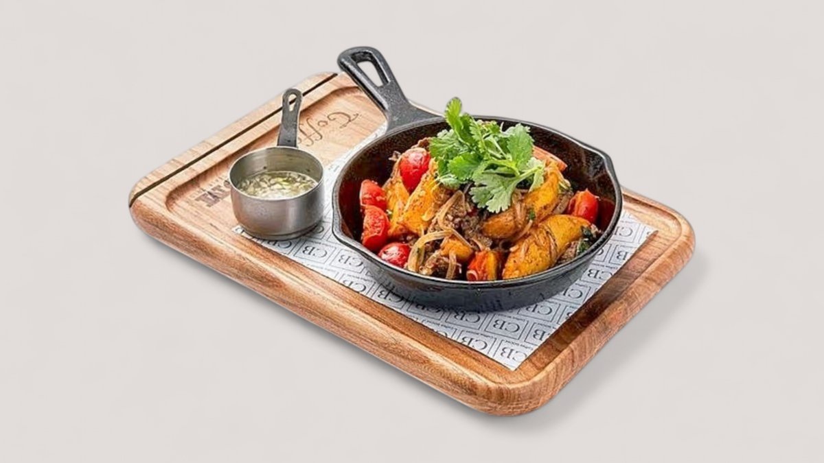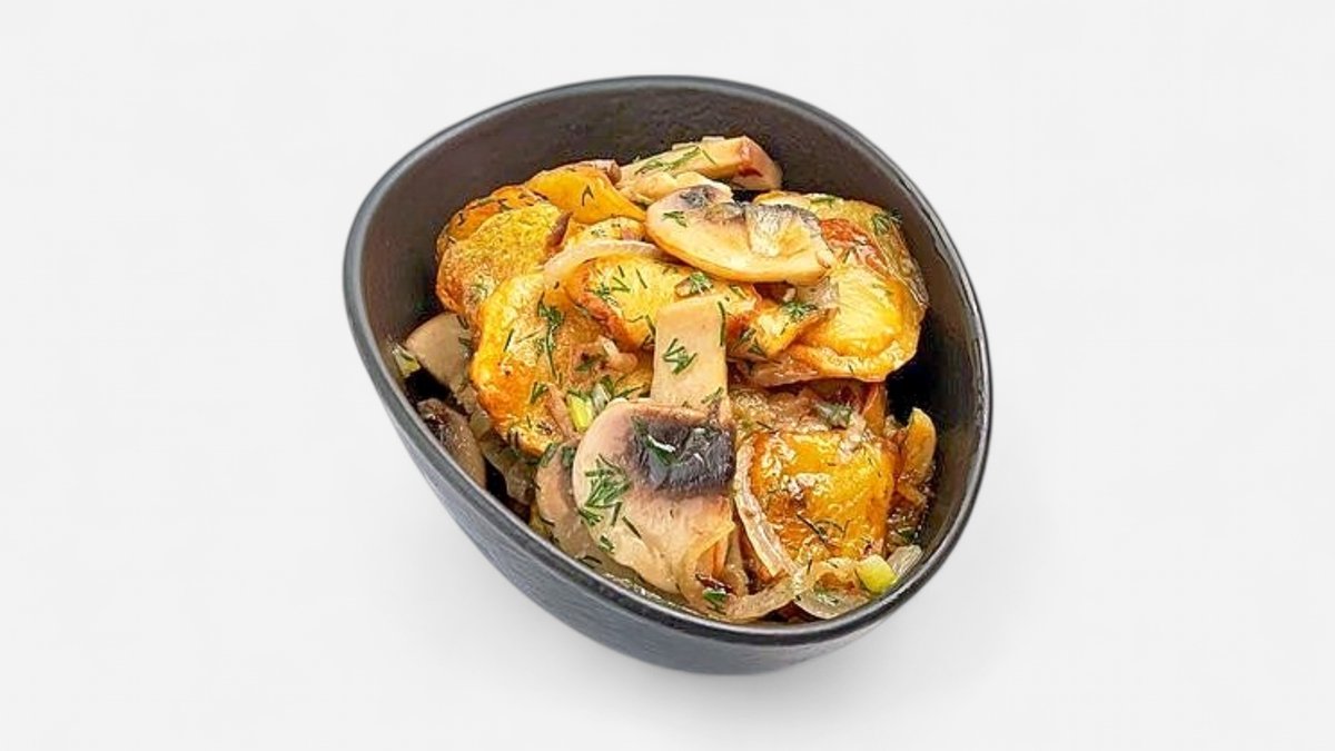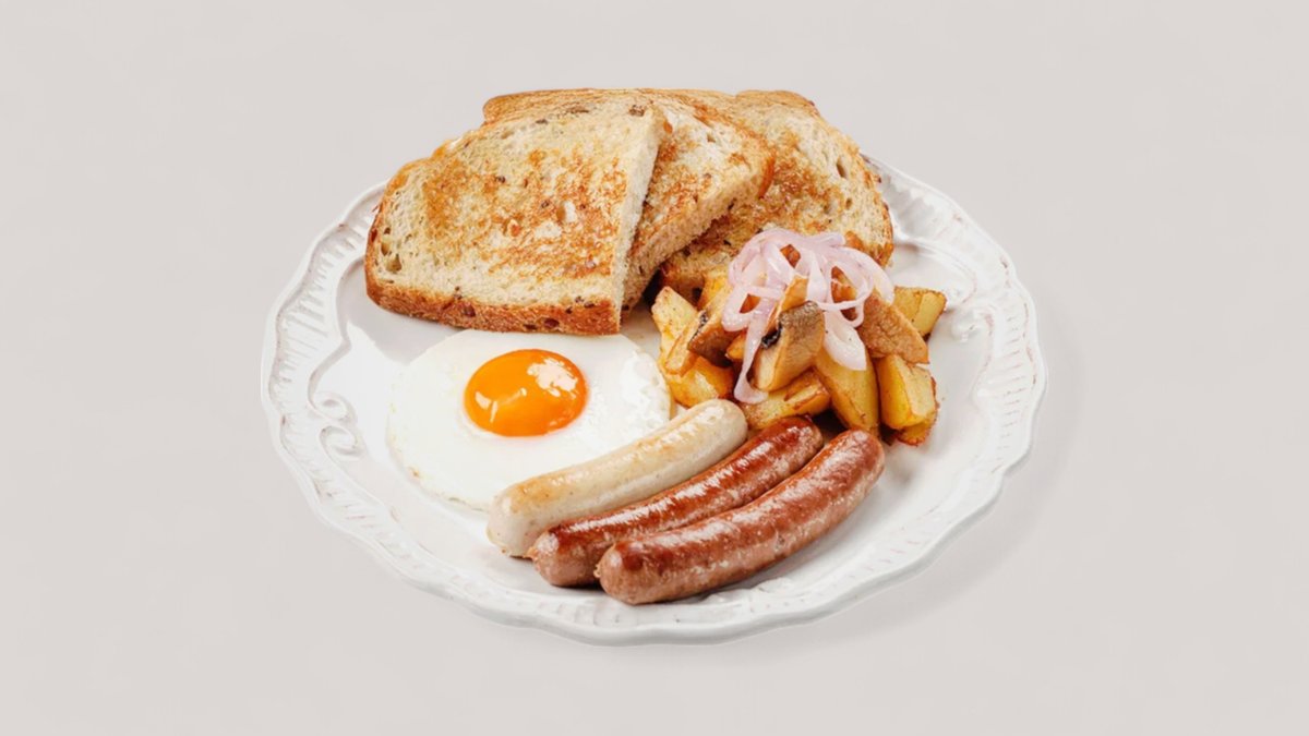 Глазунья, куриная колбаска, две говяжьи колбаски, обжареный картофель, шампиньоны, красный лук, поджаристый хлеб
