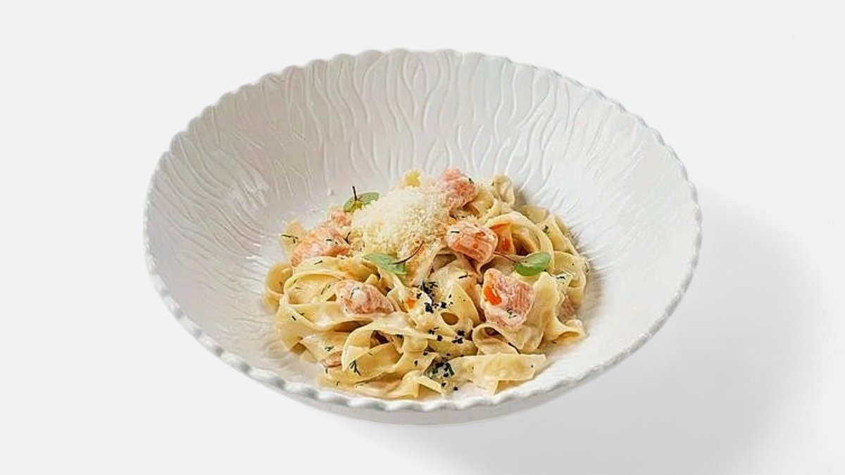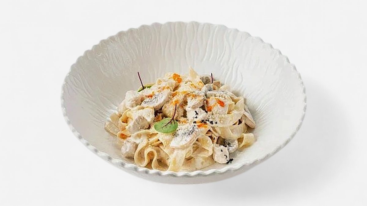 Фетучини твердых сортов, куриное филе, шампионы, сливками, пармезан