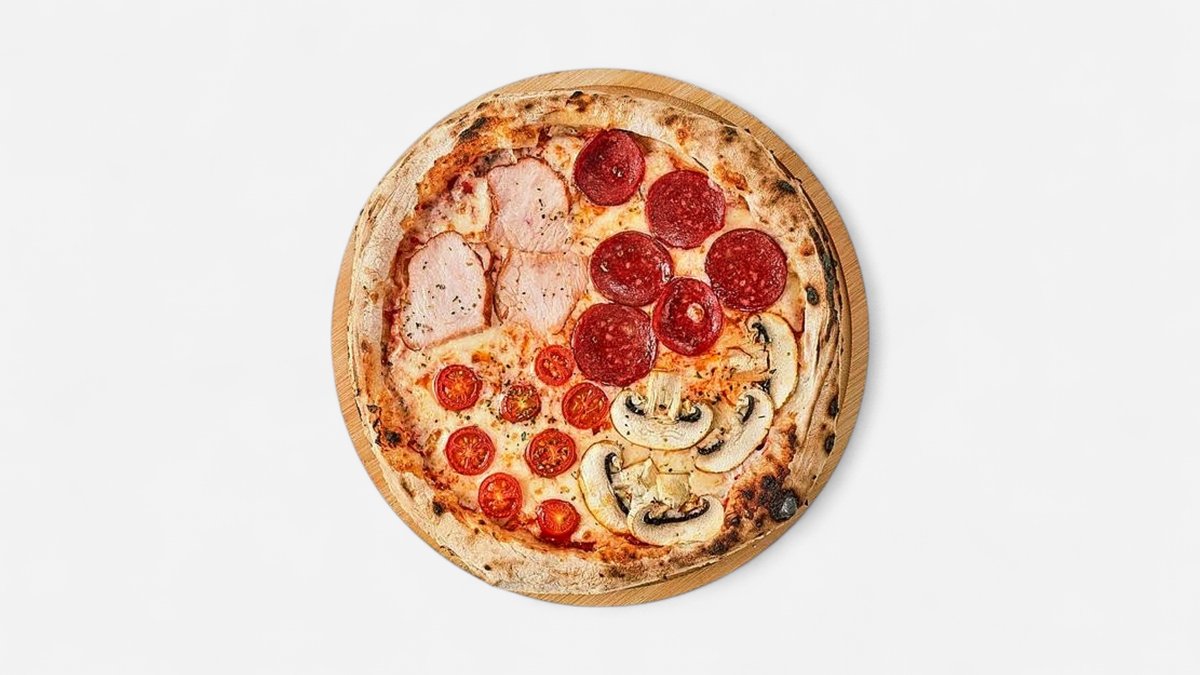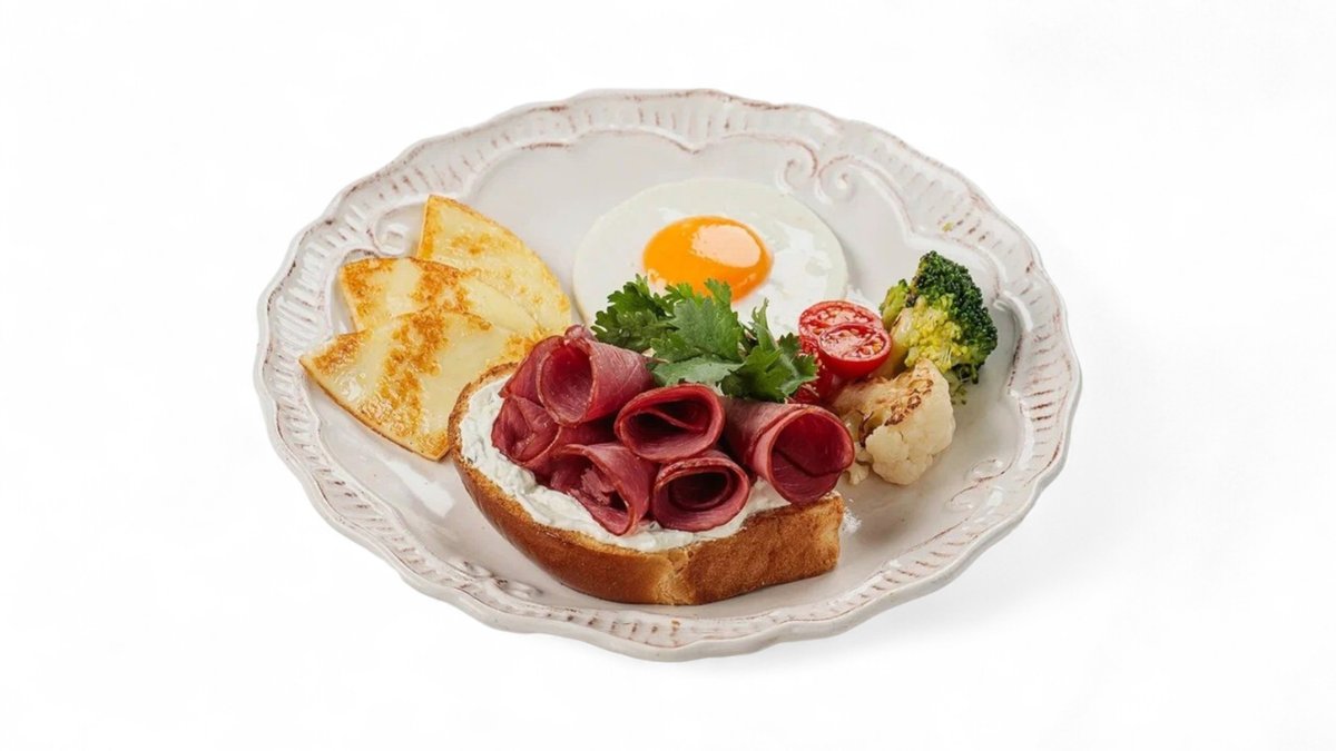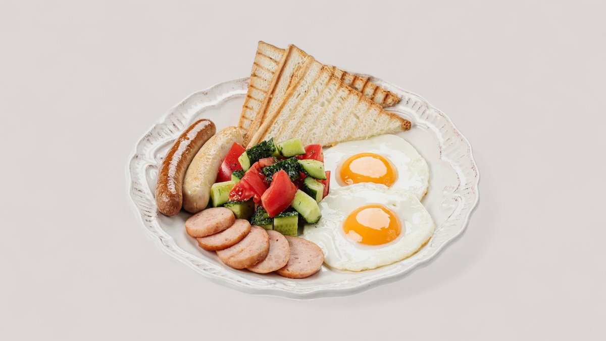 Глазунья, ветчина из индейки, куриная колбаска, говяжья колбаска, салат из свежих огурцов и помидоров, тосты