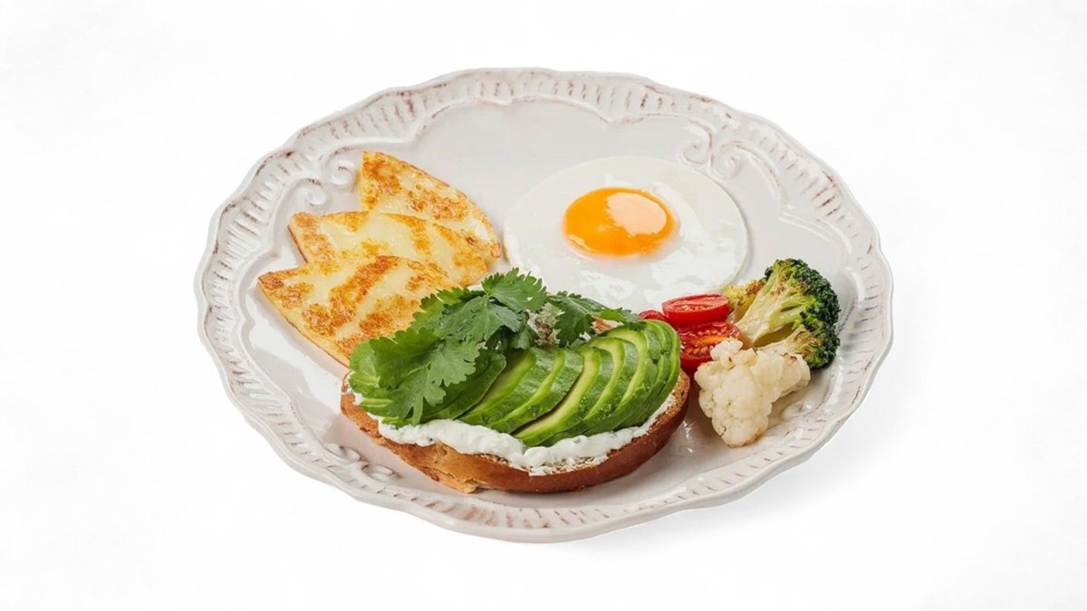 Хлеб бриошь, яйцо, авокадо, брокколи, цветная капуста, черри, сыр халуми, кинза и соус дзадзики