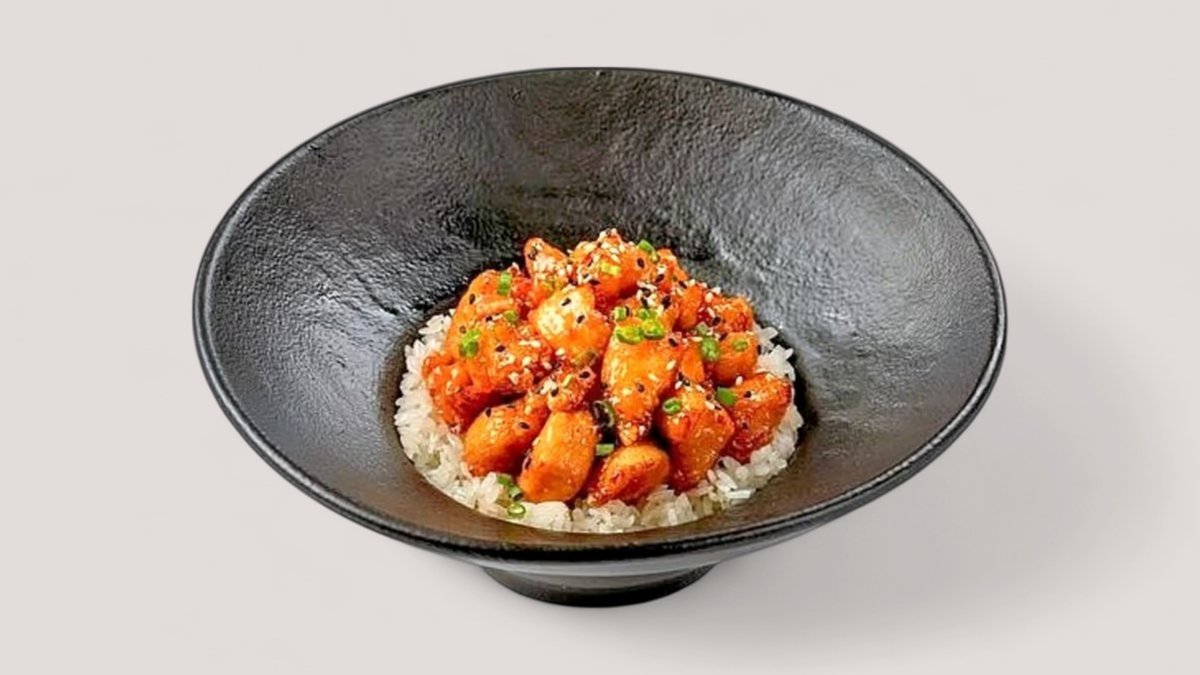 Куриное филе, рис, кунжут, сладкий соус чили, зеленый лук