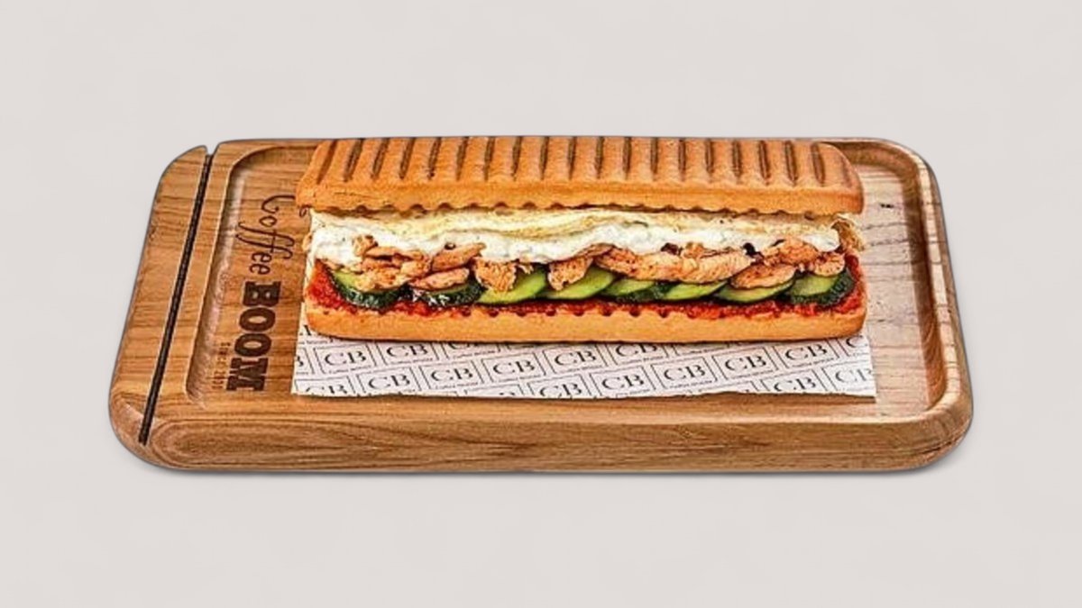 Тостерный хлеб, лист салата, соус карри, куриное филе, помидор, огурец, черри, кетчуп, майонез.