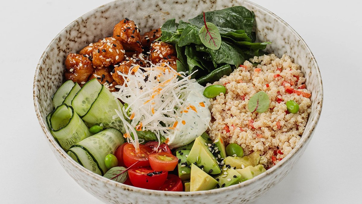 Куриное филе, рис, лист салата, огурец, черри, соус сливочно-грибной