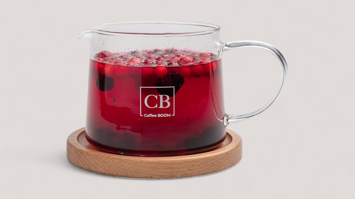Клюква, малиновый сироп, лимон. На основе черного чая
