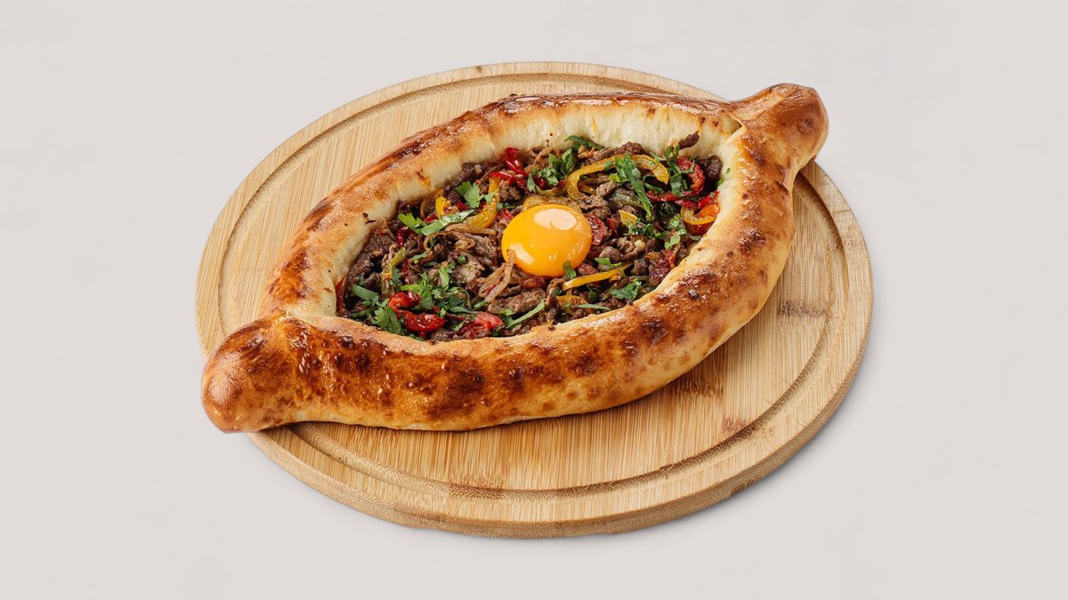 Поджаристая булочка, соус Айвар, соус Дзадзики, филе говядины, огурец соленый, яйцо жареное