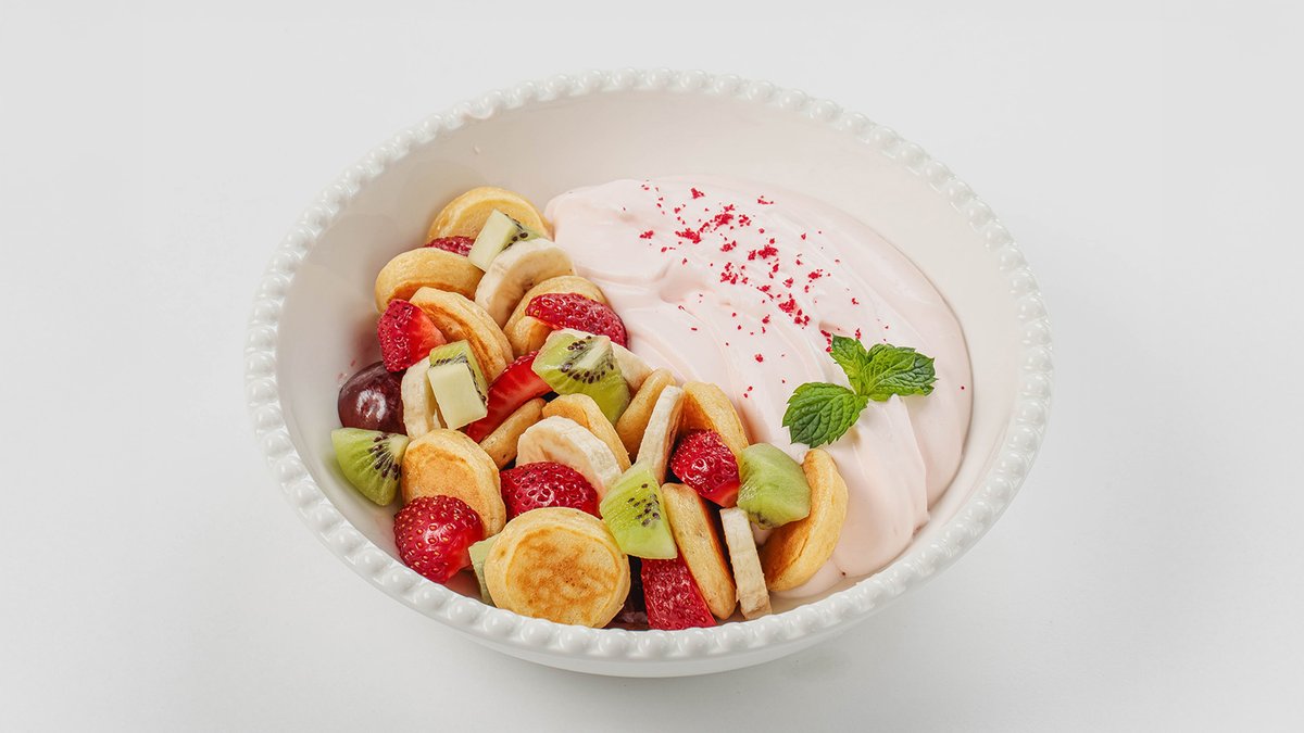 Клубника и малина, сиропы малиновый и клубничный, банан, киви, дольки манго, лимон, вода, лед, мороженое