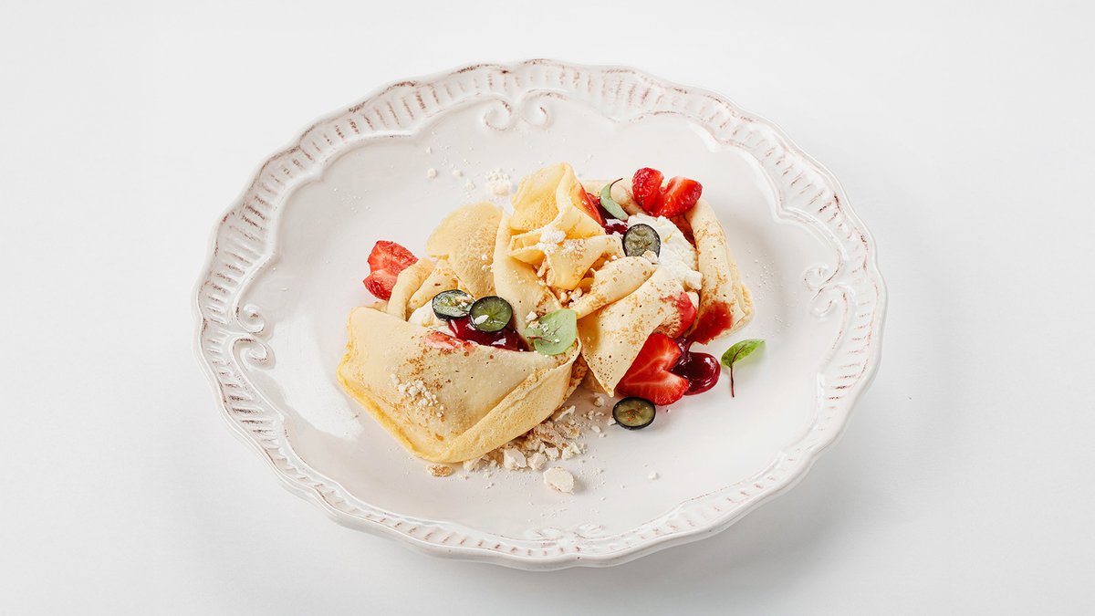 Глазунья из 2 яиц, блин, икра красная, зеленая спаржа, пармезан, куриная грудка, микс салат, черри, огурец