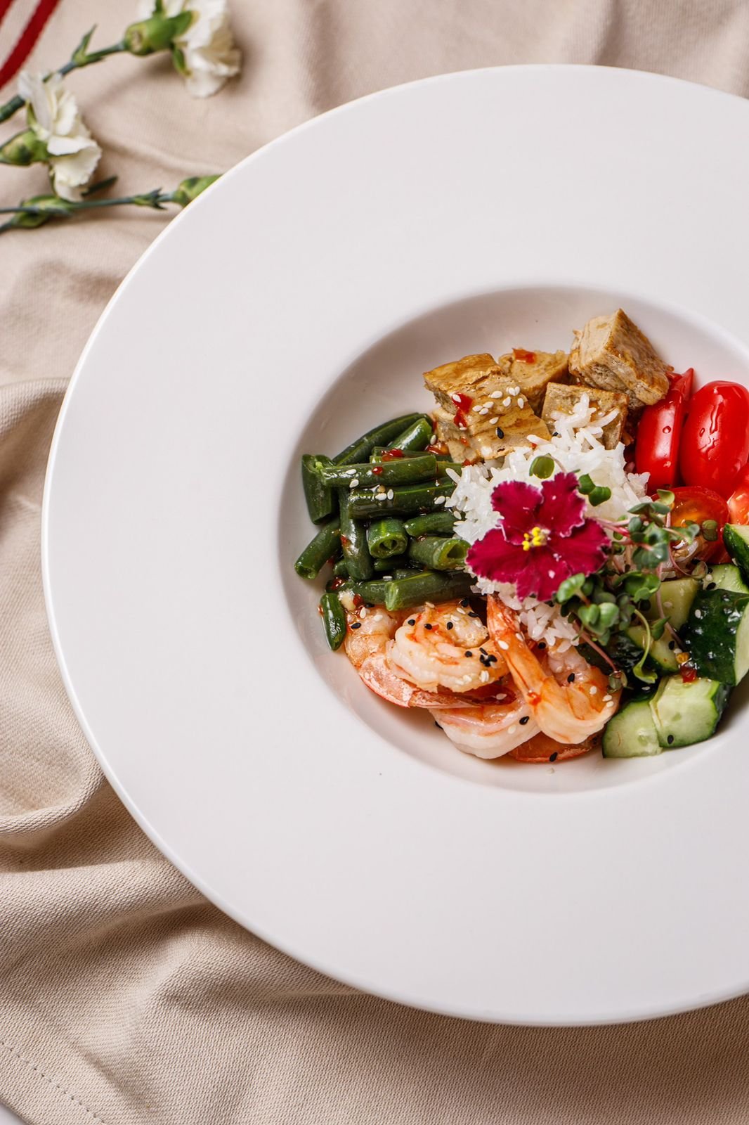 тигровые креветки, фасоль стручковая, томаты черри, рис, огурцы, яичный ролл, подается с кисло-сладким соусом
