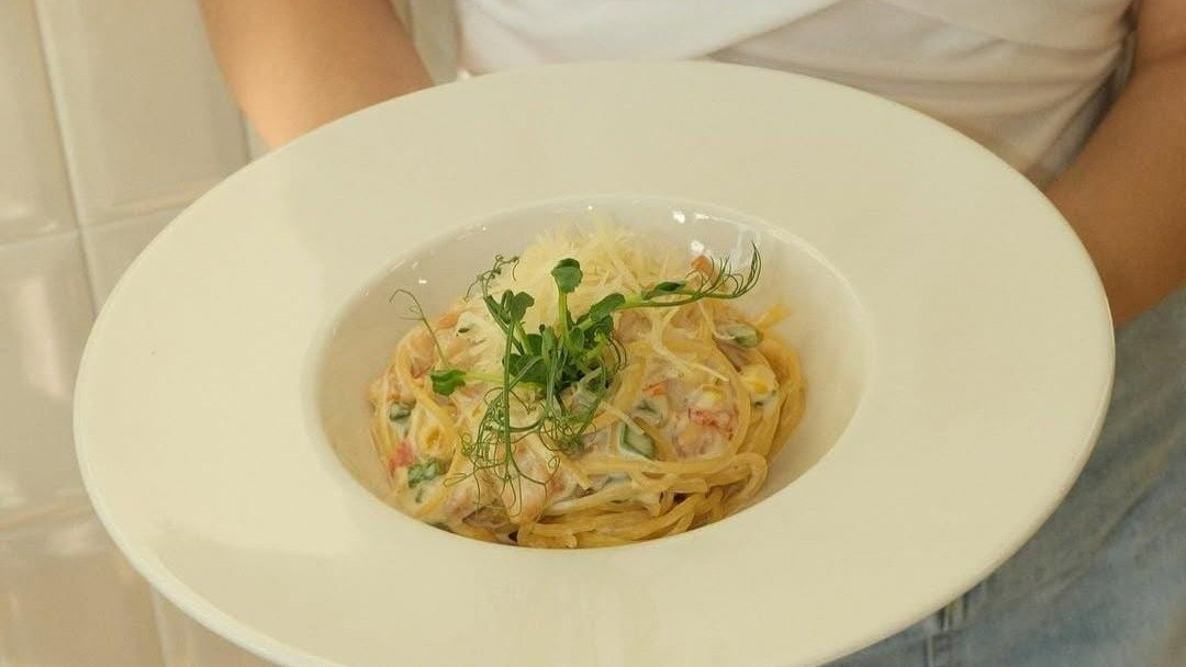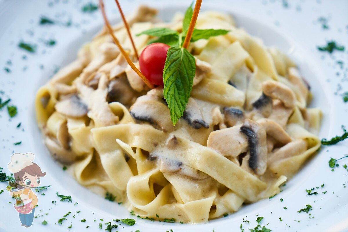 нежное куриное филе, свежие шампиньоны, паста фетучини, томаты черри, сыр Пармезан, сливочный соус
