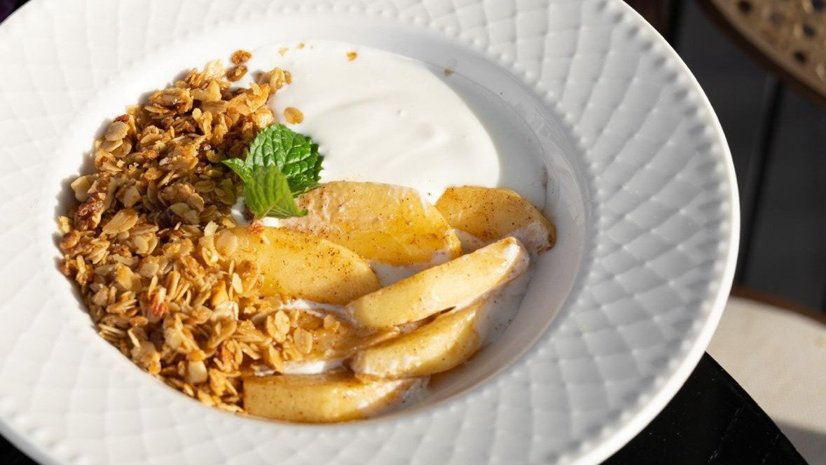 Йогурт с гранолой и каламелезированными яблоками