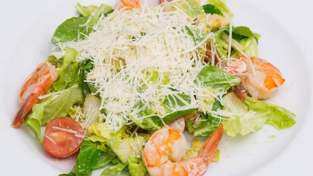 Микс листьев айсберга с тигровыми креветками, томатами черри, перепелиными яйцами и соусом Цезарь посыпанными тертым сыром Пармезан