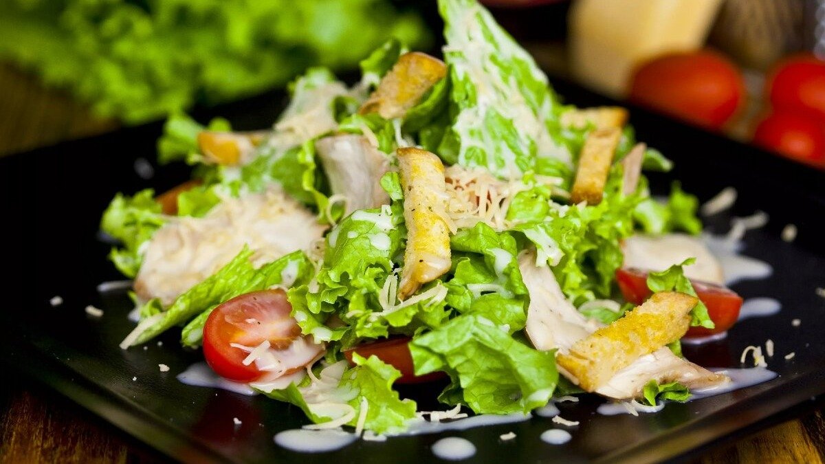 Классическое сочетание сочных листьев айсберга, томатов черри, куриного филе, горчицы и сыра Пармезан с соусом Цезарь