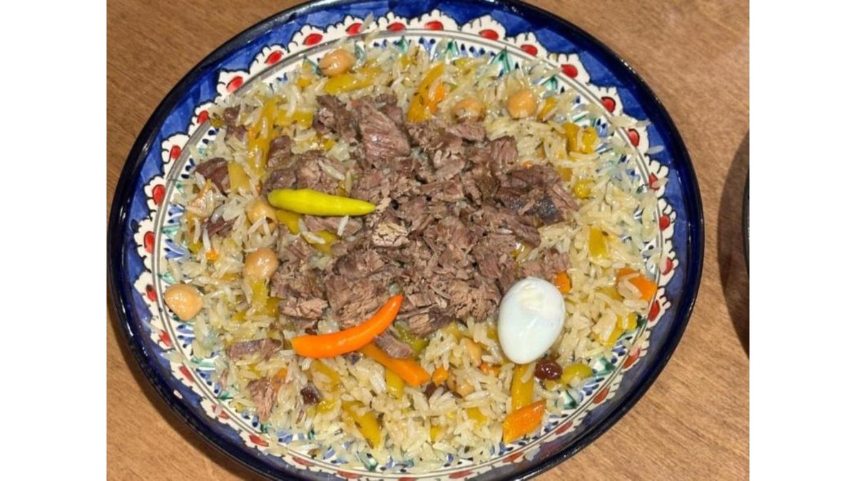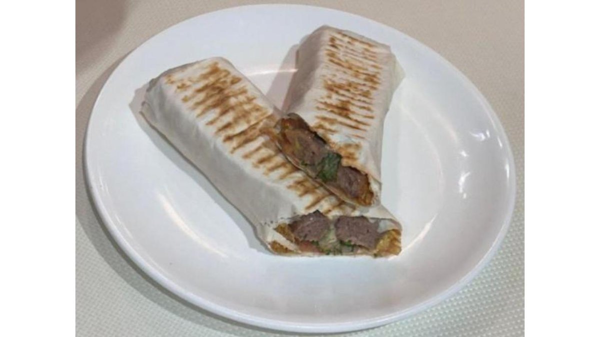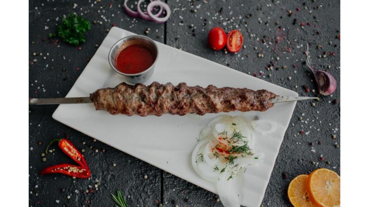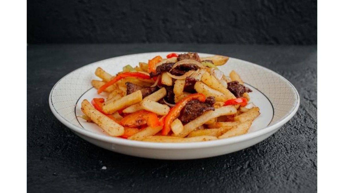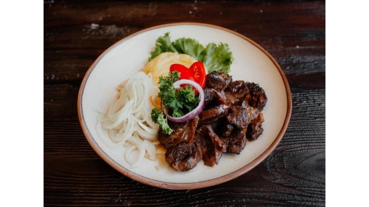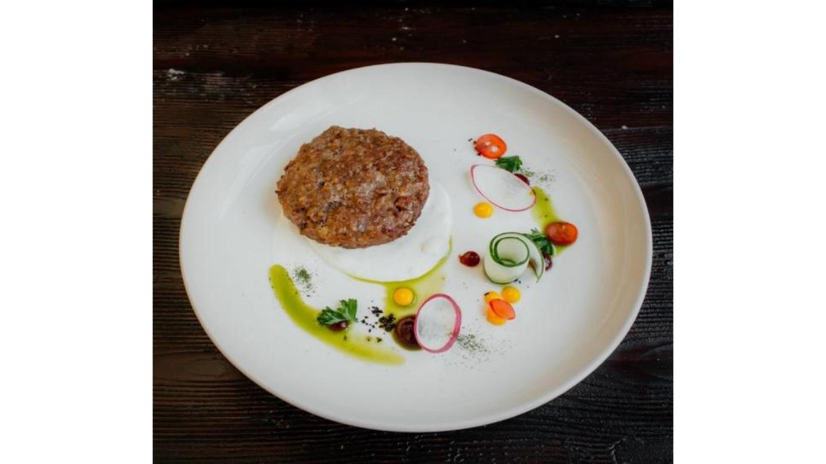 Говядина с хрустящими баклажанами и салат с соусом Мухаммара