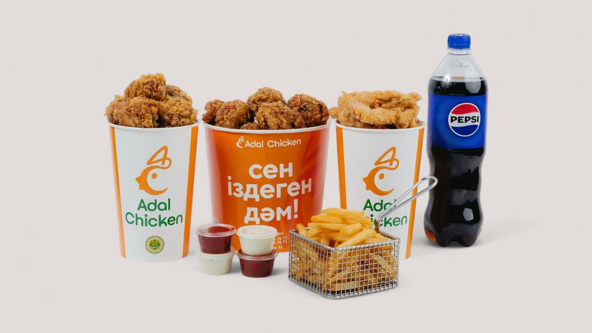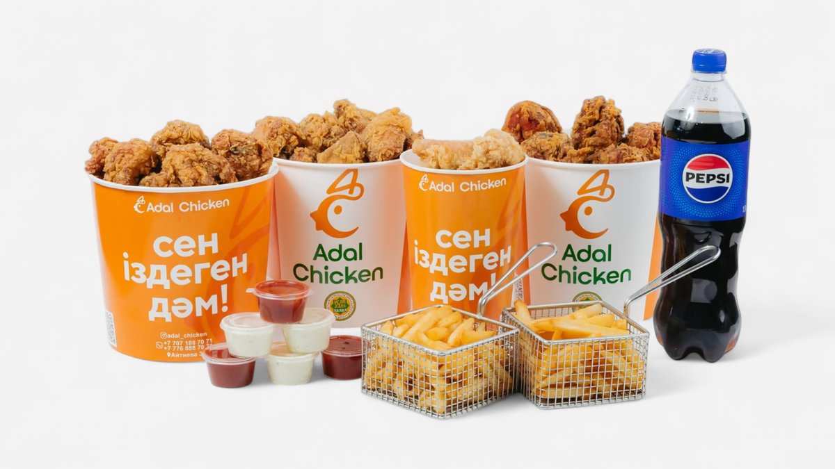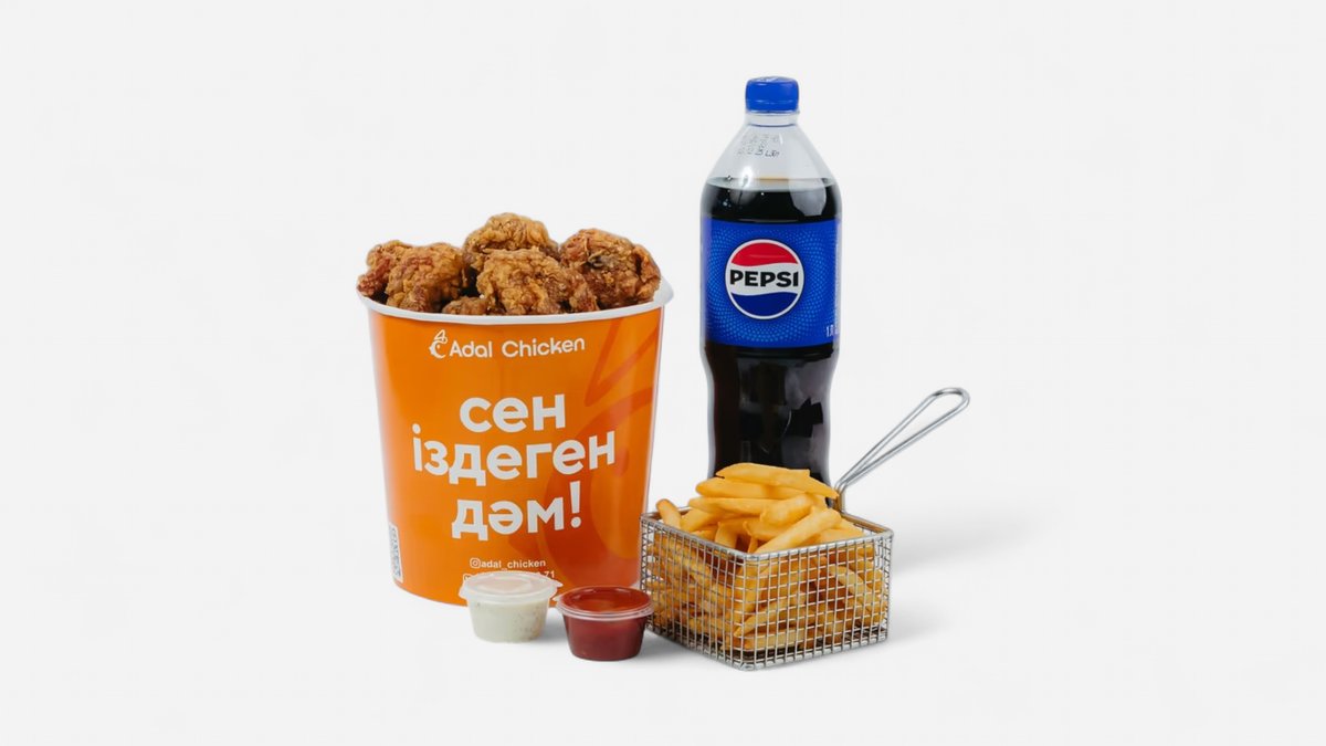 Острые крылышки - 24 шт, нежные стрипсы - 16 шт, курочка в кляре (гриль xix века) 1п - 16 шт, сочные куриные ножки - 6 шт, фирменные соусы - 6 шт, картофель фри - 2 порция (большая), в подарок - Pepsi 1 л