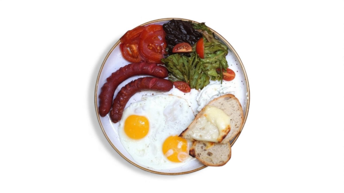 Қызанақ және шұжықтар қосылған қуырылған жұмыртқа