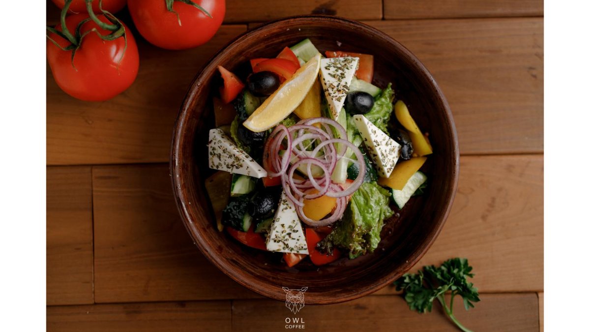 Греческий салат из помидоров, сладкого перца, огурцов, сыра феты, маслин, заправленный оливковым маслом с солью, чёрным перцем.