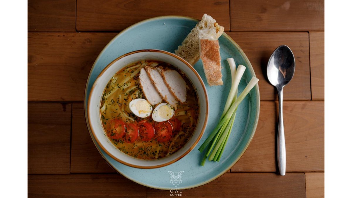 Куриный суп с лапшой варёными яйцами и куриным мясом.