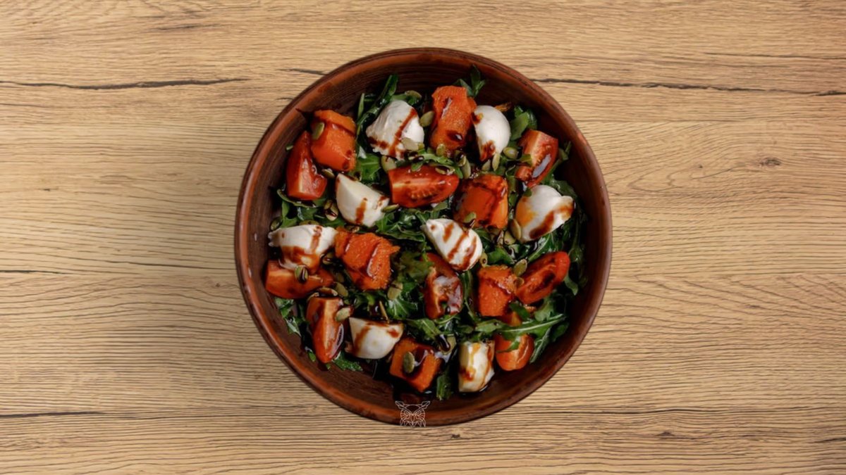 Состав салата: руккола, запеченная тыква, сыр в шариках моцарелла, томаты черри, тыквенные семечки, медового оливковая заправка.