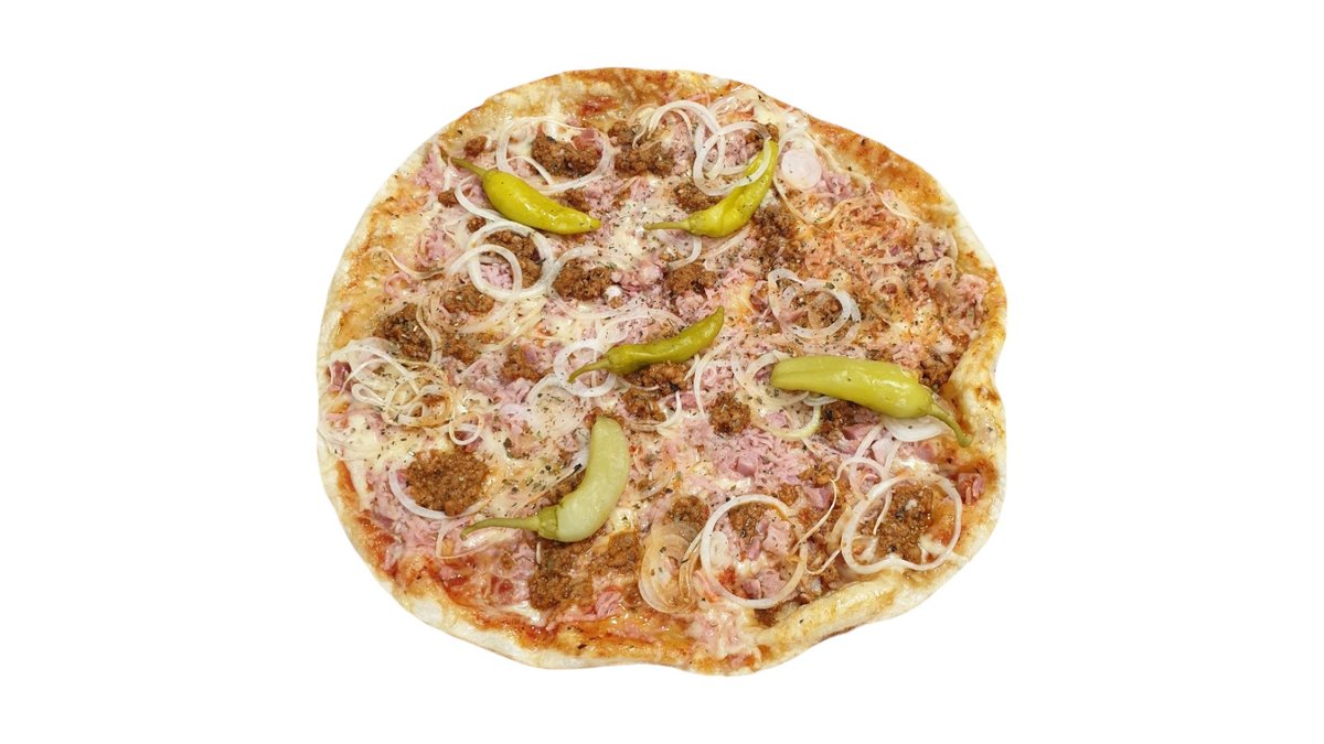Fermentinis sūris, pomidorų padažas, česnakinis aliejus, tarkuotas kumpis, faršas, šoninė kubeliais, balti svogūnai, peperone pipiras