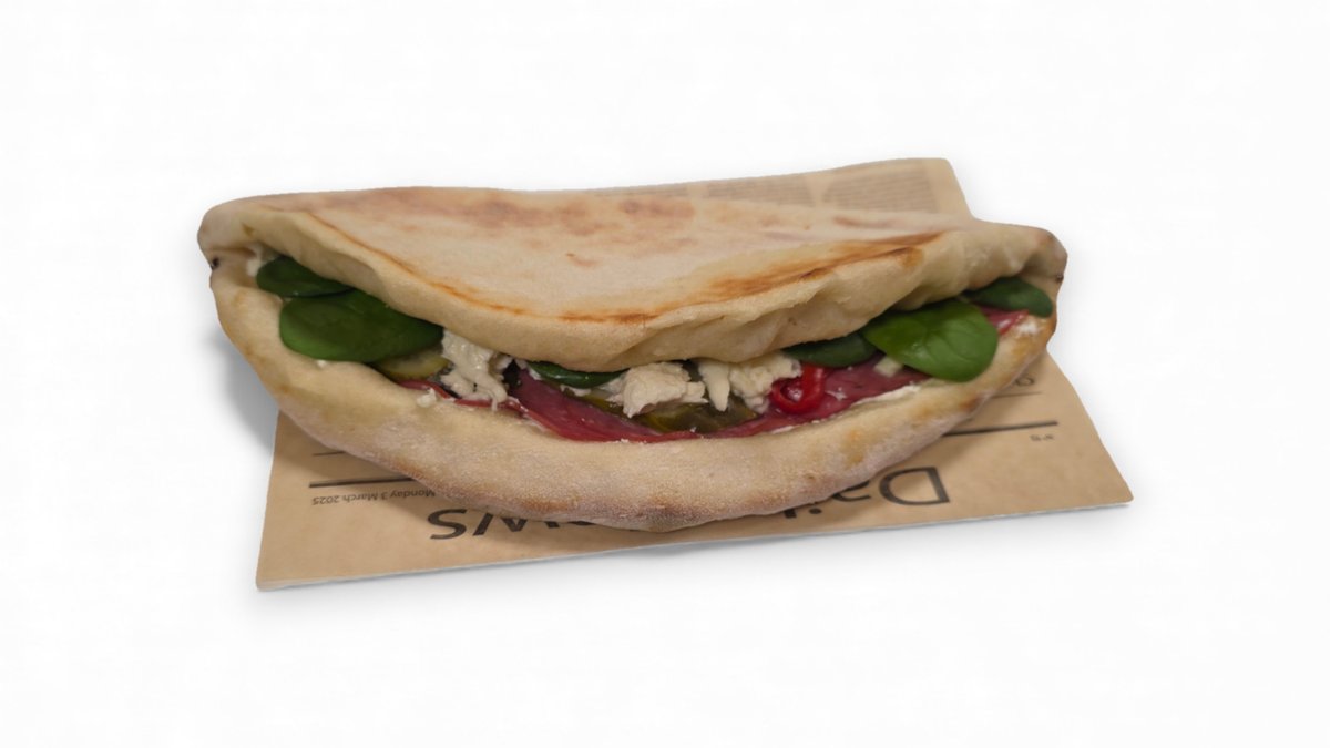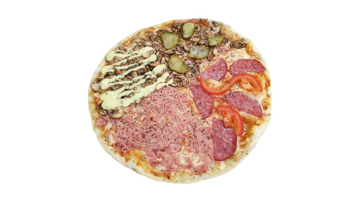 Pomidorų padažas, mocarela sūris, kumpis, saliami dešra, pievagrybiai, marinuoti agurkėliai, svogūnas raudonas pjaustytas, "bernaise" padažas, česnakinis bazilikų aliejus