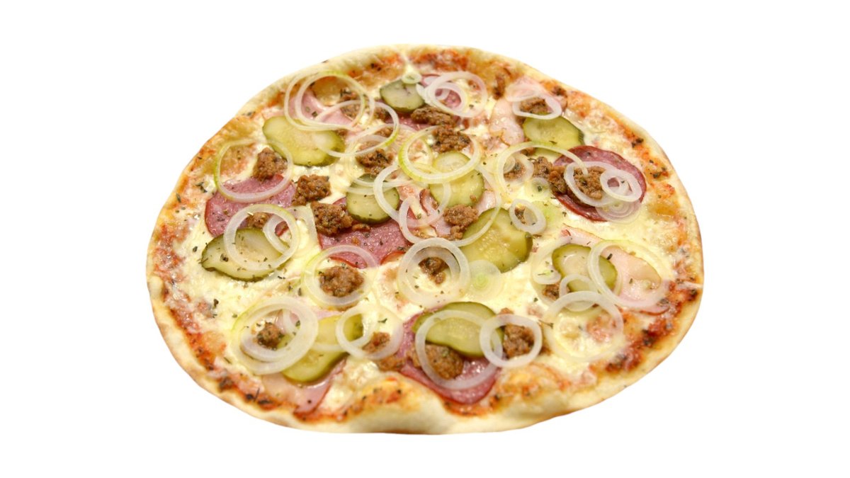 Fermentinis sūris, pomidorų padažas, česnakinis aliejus, faršas, smulkinta šoninė, marinuotas agurkas, koncervuota paprika, svogūnas