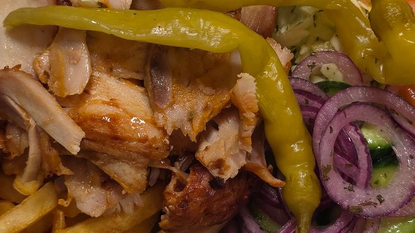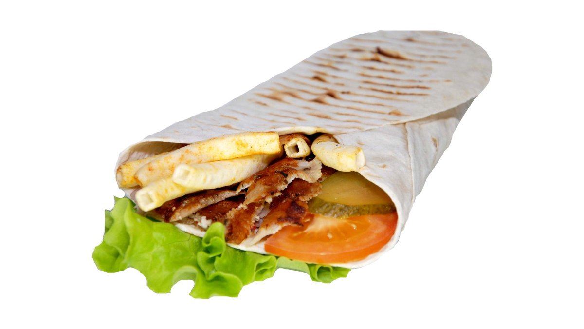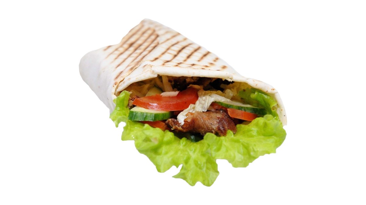 Kebabo mėsa, lavašas, pekino salotos, šviežias kopūstas, pomidorai, svogūnai, agurkai, bistro padažas