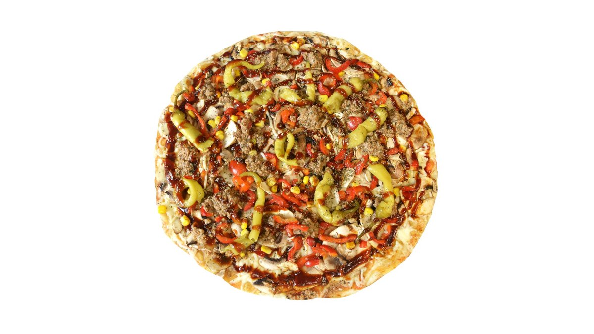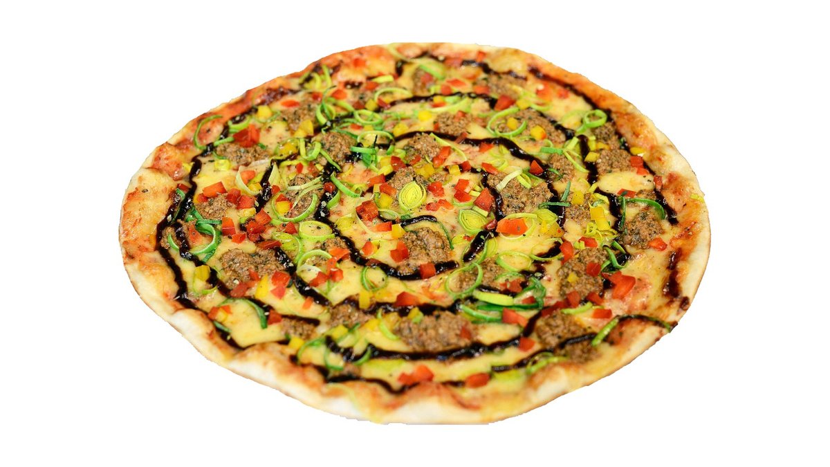 Fermentinis sūris, pomidorų padažas, česnakinis aliejus, jautiena, konservuota paprika, mėlynas svogūnas, bbq padažas